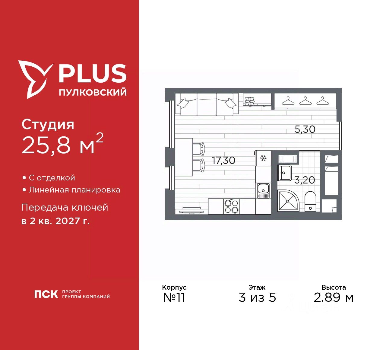 Просторная 1-комн. квартира-студия с отделкой в ЖК ''PLUS Пулковский'' на 3 этаже. Общая площадь: 25.8 кв.м., площадь гостиной 17.3 кв.м., из которых 5 кв.м. выделено под кухонную зону. Все окна выходят на одну сторону. В квартире один совмещенный санузел. Высота потолков 2.89 м.