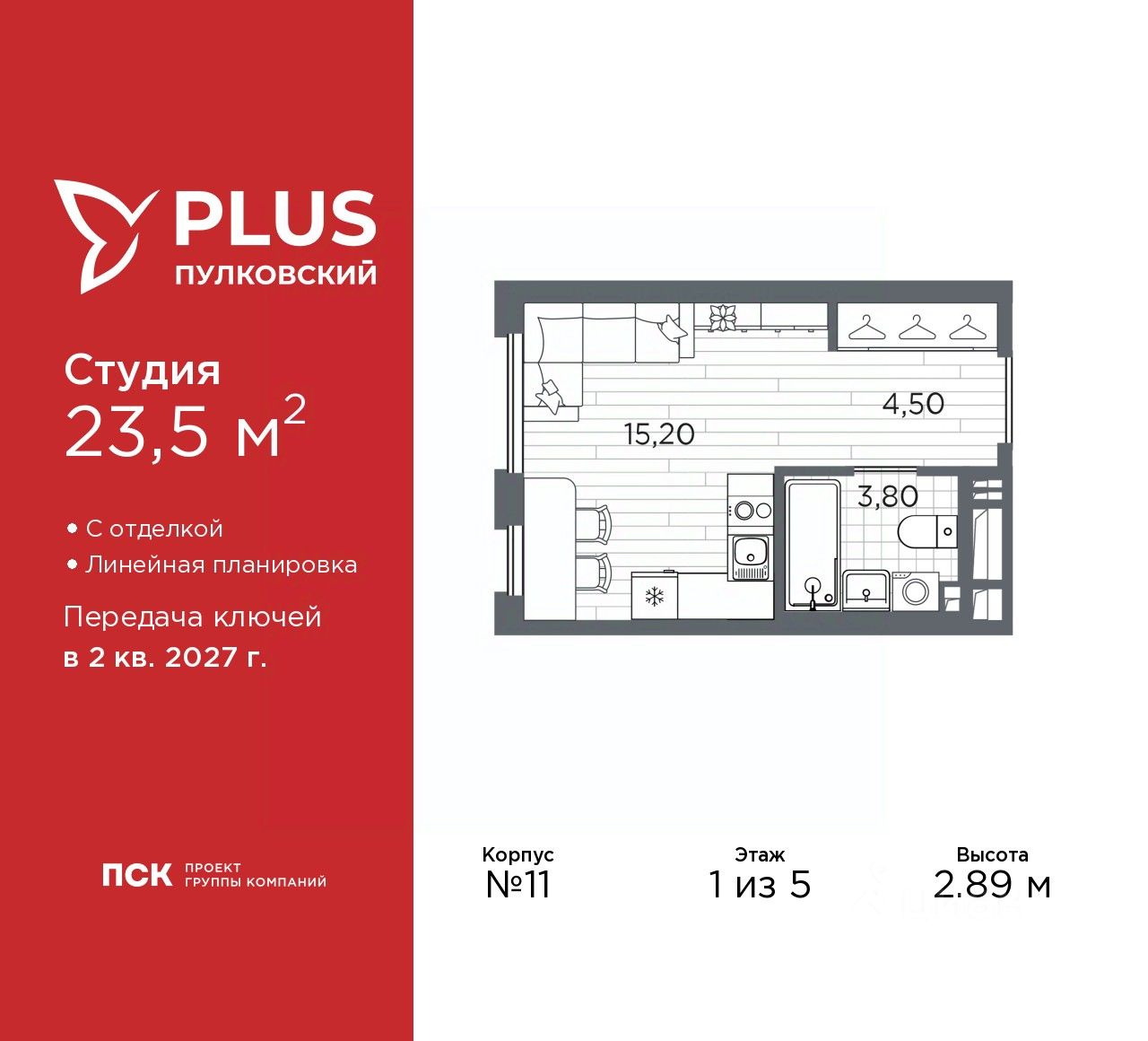 Просторная 1-комн. квартира-студия с отделкой в ЖК ''PLUS Пулковский'' на 1 этаже. Общая площадь: 23.5 кв.м., площадь гостиной 15.2 кв.м., из которых 5 кв.м. выделено под кухонную зону. Все окна выходят на одну сторону. В квартире один совмещенный санузел. Высота потолков 2.89 м.