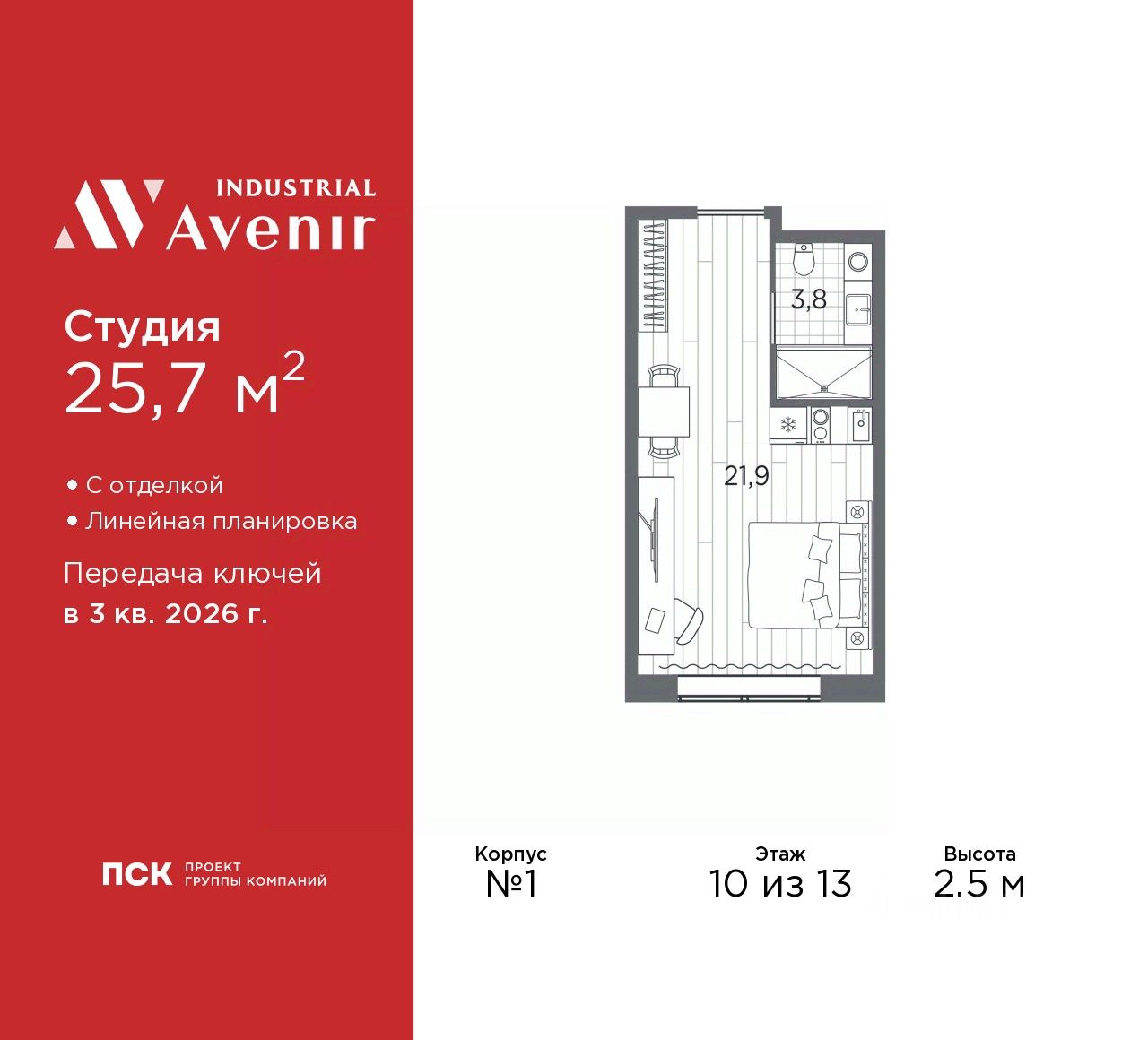 1-комн. апартаменты-студия с отделкой в ЖК ''Industrial AVENIR'' на 10 этаже. Общая площадь: 25.7 кв.м., площадь гостиной 21.9 кв.м., из которых 5 кв.м. выделено под кухонную зону. Все окна выходят на одну сторону. В апартаментах один совмещенный санузел. Высота потолков 2.5 м.
