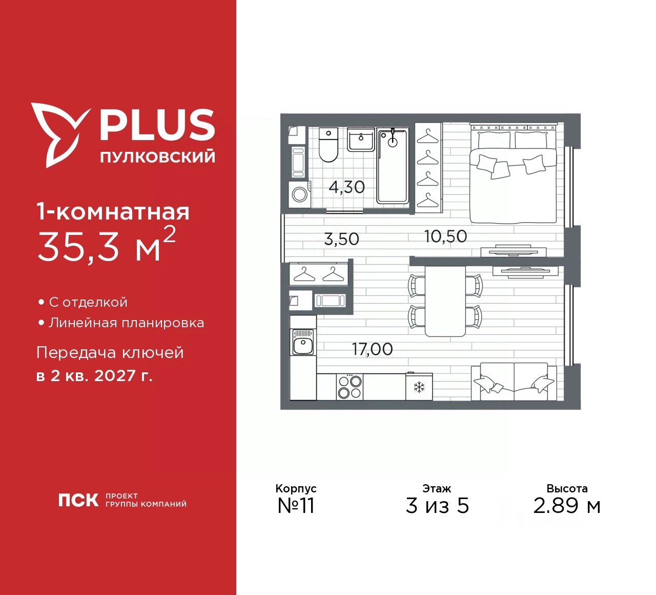 1-комн. квартира от застройщика с отделкой в ЖК ''PLUS Пулковский'' на 3 этаже. Общая площадь: 35.3 кв.м., жилая: 10.5 кв.м., площадь просторной кухни-столовой: 17 кв.м. Все окна выходят на одну сторону. В квартире один совмещенный санузел. Высота потолков 2.89 м.