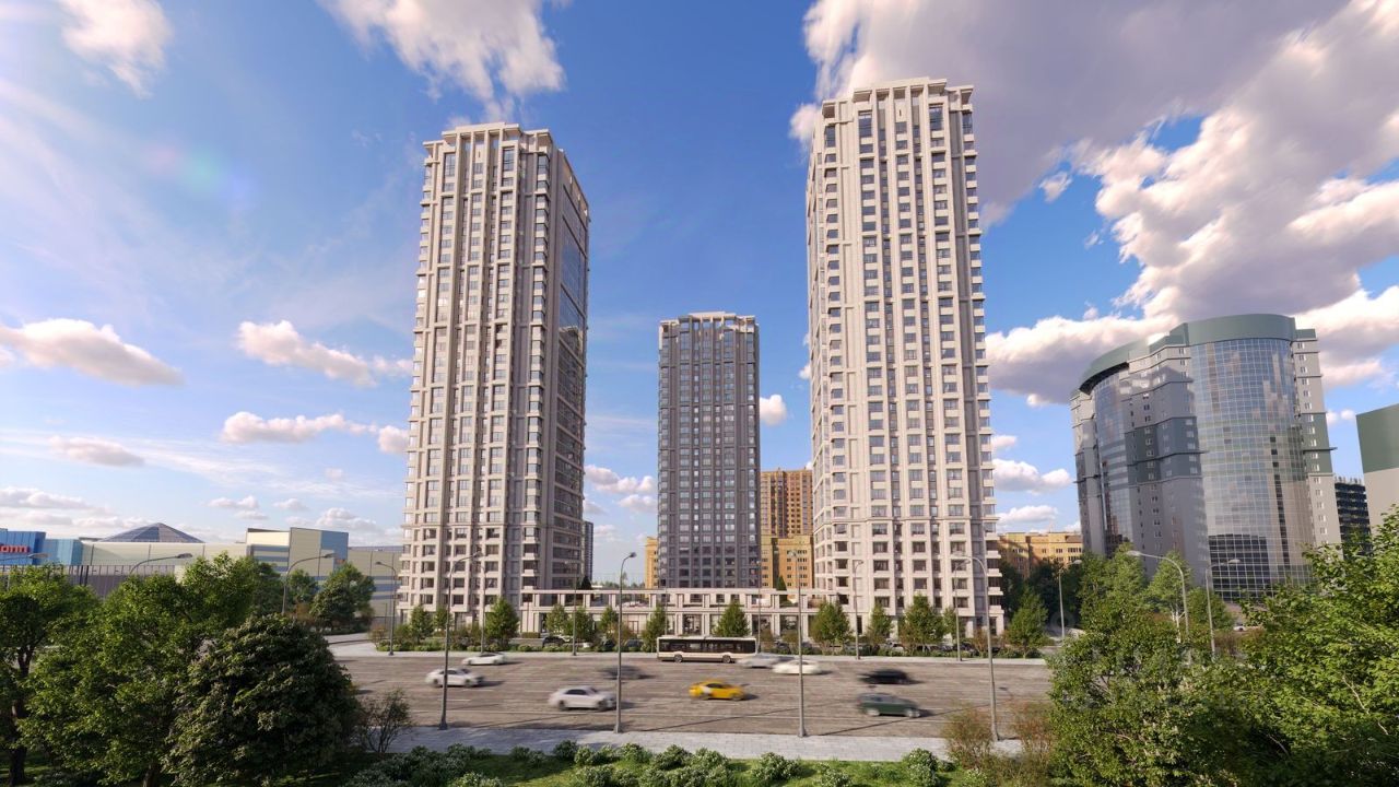 АРХИТЕКТУРА Комплекс представляет замкнутую постройку из трех башен. Две башни 30 этажей и одна 25-этажная расположены в шахматном порядке, что позволяет создать парадную симметрию и в то же время разреженную, ''проницаемую'' структуру застройки всего комплекса. При этом башни расставлены с оптимальными паузами, чтобы каждому метру доставалось максимум солнца. Архитектурно-художественный образ выполнен в стиле модернизма в современном прочтении. В отделке фасадов использован облицовочный кирпич белого цвета разных тонов. Комплекс строится по технологии монолитный каркас с кирпичным заполнением, облицовка декоративным керамическим белым кирпичом. А кладка наружной версты уступами, наличие ниш, поясов и эркеров добавляет фасадам пластики. В то же время комплекс зданий смотрится цельным и единым благодаря общей фактуре. Первые этажи с помещениями общественного назначения объединены в один общий стилобат с одноэтажным ритейлом с эксплуатируемой кровлей. Из каждой башни можно легко попасть в лобби, бассейн со SPA-комплексом, фитнес-зал, паркинг не выходя на улицу.