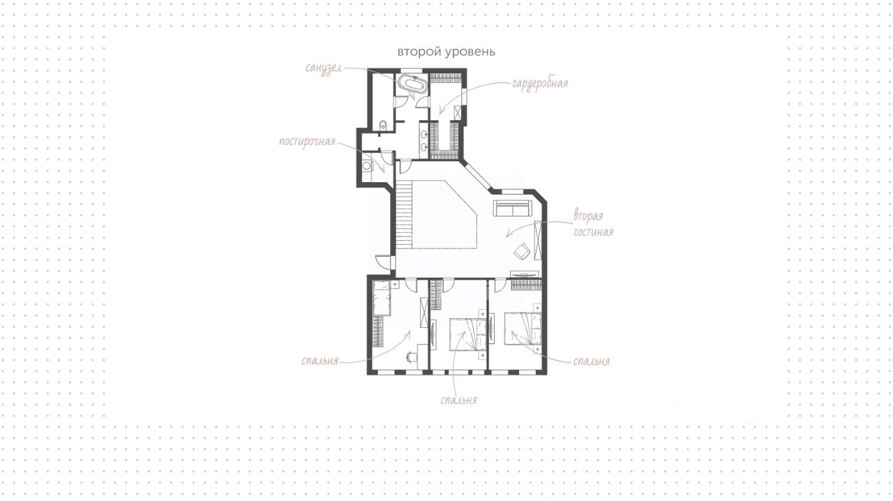 На 1 уровне расположена уютная гостиная с камином и эркерным окном, кухня, просторный холл, кабинет или дополнительная спальня, санузел. Два этажа соединяет широкая деревянная лестница. Планировка 2 уровня включает спальный блок из трёх спален, холл с библиотекой, гардеробную, санузлы. Высота потолков до 6 метров. Окна выходят на две стороны света.