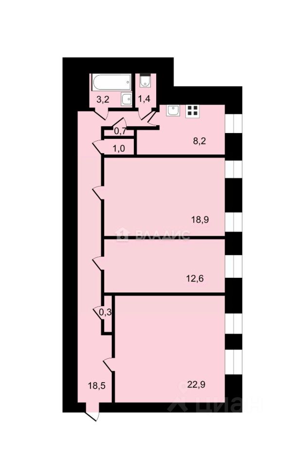Код объекта: 1501437. О КВАРТИРЕ: Продается светлая 3-х комнатная квартира площадью 87,7 кв.м на 3-м этаже 4-х этажного кирпичного дома. Квартира с 3-мя изолированными комнатами 12,6, 18,9 и 22,9 кв.м, из окон вид во двор, высота потолков 2,97 метра, кухня 8,2 кв.м, санузел раздельный. Есть зоны хранения в коридоре - три встроенных шкафа.
