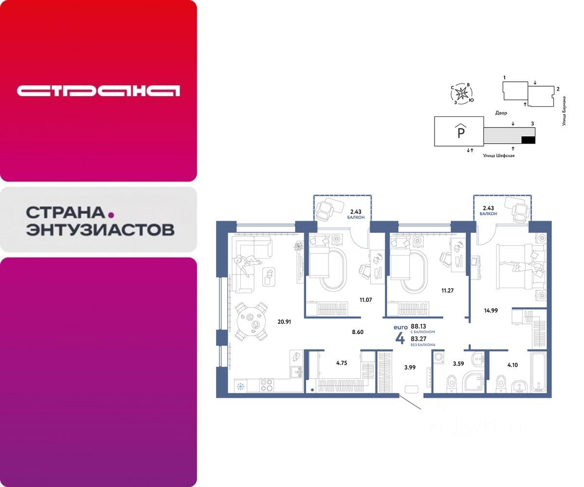 Продается 4комнатная квартира на 10 этаже от застройщика Страна Девелопмент. Площадь квартиры 88,13 кв. м.
