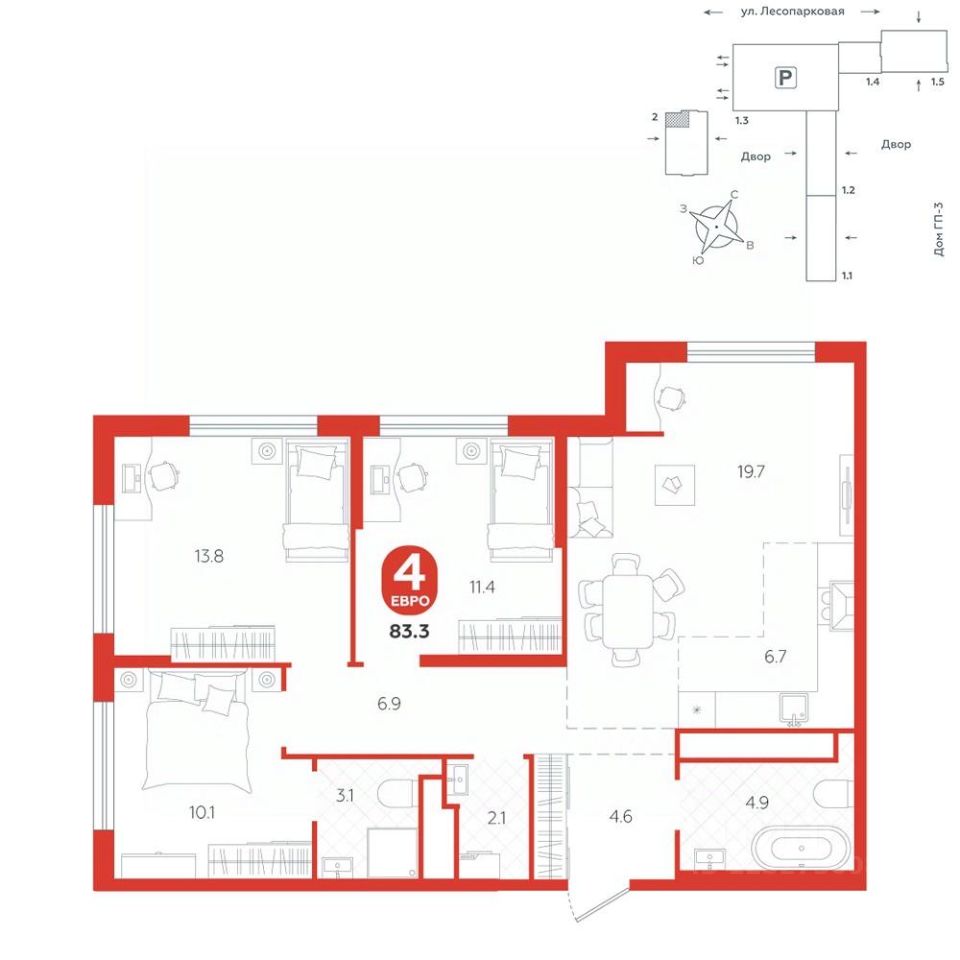 Квартира располагается в ГК ''Чистые Пруды'' от ''Паритет девелопмент''. Это флагманский проект компании в Тюмени. Расположение вдали от шумных улиц и оживленного центра создает ощущение жизни на природе и окружает тишиной и спокойствием. Есть вся необходимая социальная и коммерческая инфраструктура: магазины и сфера услуг на первых этажах. Школы, сады, поликлиника, парки в шаговой доступности. Квартал строится в районе Новой Лесобазы. Рядом выезд на объездную, что существенно экономит время. Поездка до центра города на автомобиле занимает 15-20 минут. Городские кварталы ''Чистые Пруды''сформирован из домов переменной этажности и многоуровневых паркингов. Ввод 1 очереди строительства запланирован на II кв. 2028 года. Всё благоустройство квартала представлено двумя функциональными зонами: приватная внутри дворовая и общественная. Каждый закрытый двор имеет выход на единую променадную зону - бульвар. Концепция благоустройства основана на принципе модульности, что формирует основную идею приватности. Приватность проекта подчеркивает его особенный климат внутри. Модульное благоустройство позволит максимально эффективно использовать пространство двора и удовлетворить потребности различных категорий жителей. В квартирах базово выполнена улучшенная черновая отделка, которая включает в себя: выровненные стены, стяжка пола с шумоизоляцией, горизонтальная разводка отопления, установлены счетчики с телеметрией, окна с 5-камерным профилем и надежные входные двери. При желании можно добавить ремонт от застройщика и включить его в стоимость ипотеки, что позволит сэкономить на стройматериалах и переехать сразу после получения ключей. Характеристики квартиры: этаж - 22 количество комнат - 4 номер помещения - 214 площадь квартиры - 83,3 кв.м Гармоничные пропорции и большие окна наполняют пространство светом, создавая уютную атмосферу. Умное зонирование позволяет удобно организовать как рабочую, так и жилую зоны, что особенно важно для современных жителей. Санузел спроектирован с учетом всех потребностей: здесь есть ванна и место для стиральной машины. Каждый метр квартиры используется с максимальной эффективностью, что делает эту планировку отличным выбором для тех, кто ценит комфорт и удобство.