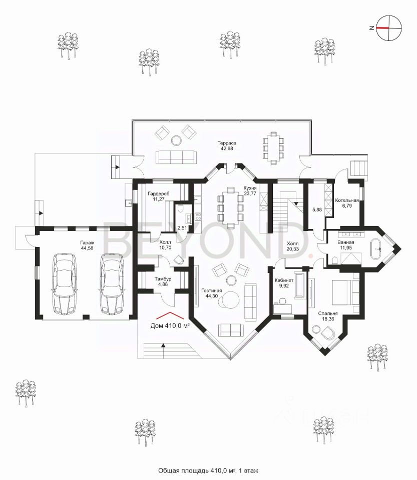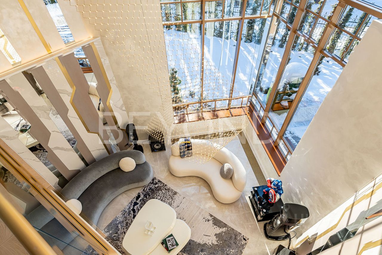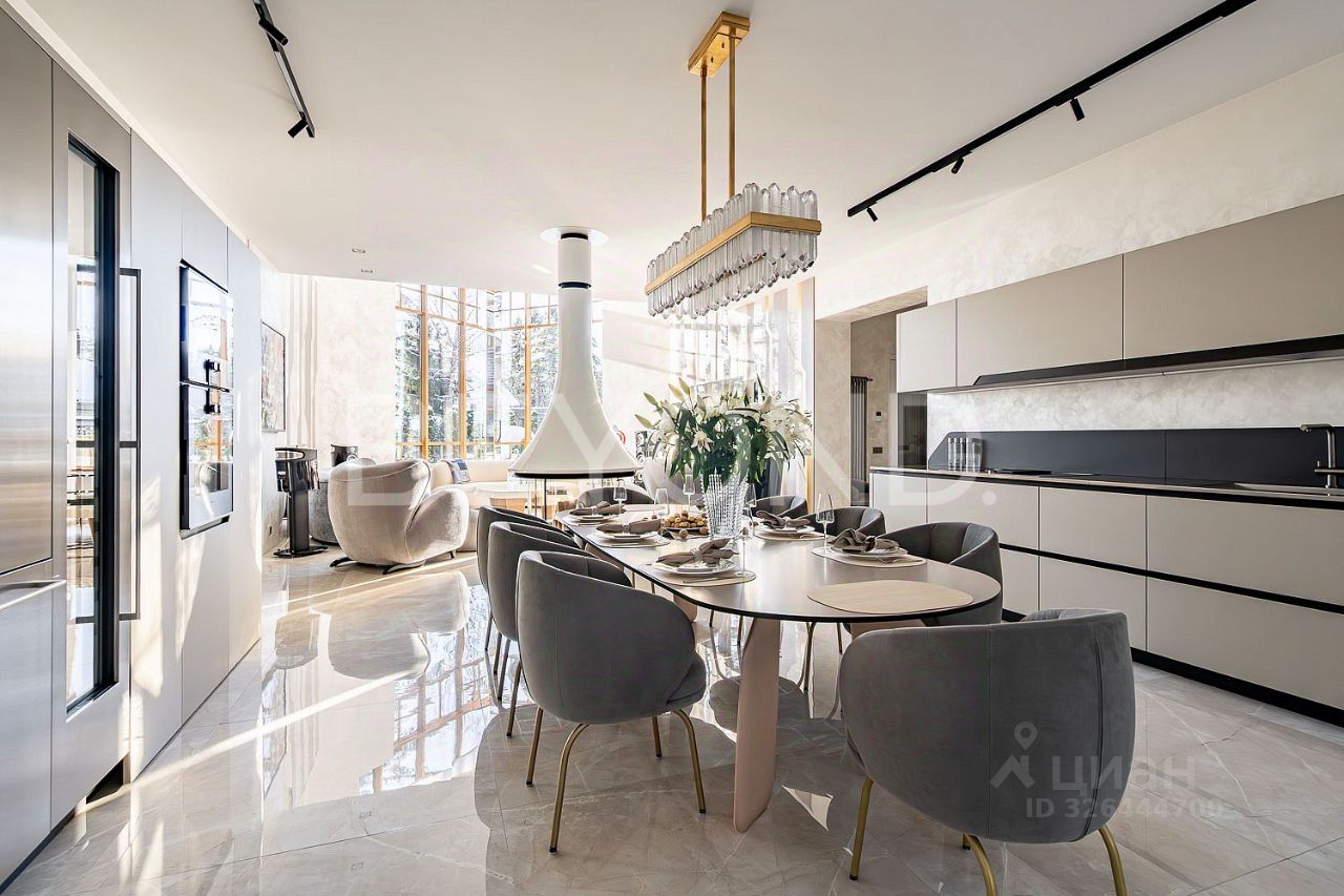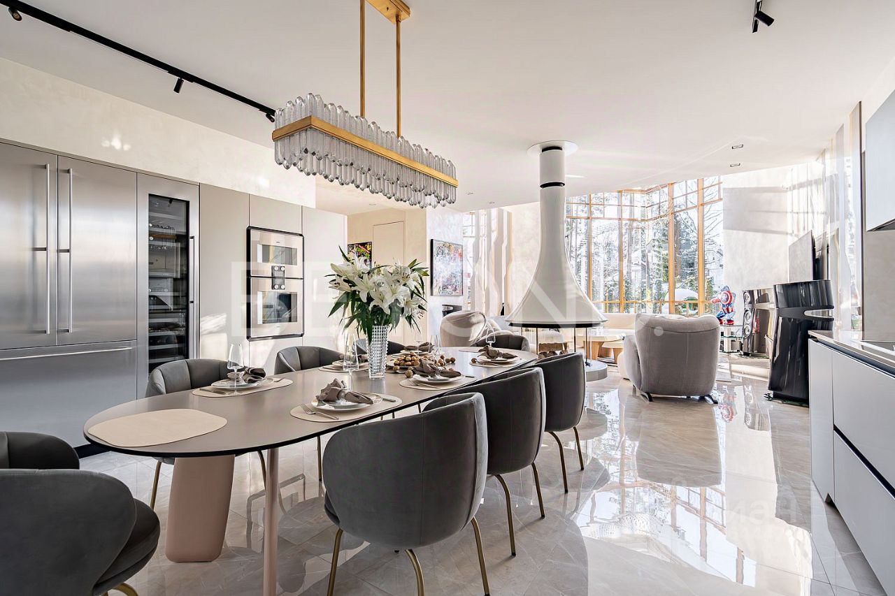 Продаётся изысканный загородный дом площадью 410 м², созданный студией дизайна Art Spice. Дом, в котором каждая деталь отражает современные эстетические принципы — от архитектуры до инженерных решений. Объект полностью готов к проживанию: атмосфера, функциональность и продуманные сценарии жизни уже встроены в пространство. С первых шагов — прихожая с большой гардеробной зоной. Слева — кухня Snaidero с техникой Gaggenau — решение для тех, кто ценит безупречное качество и комфорт. Столовая с выходом на террасу, где организованы обеденная группа и лаундж-пространство. Гостиная с потолком стремящимся ввысь — центральная сцена дома. Панорамное остекление стирает границу между интерьером и садом, впуская свет и создавая ощущение открытости.