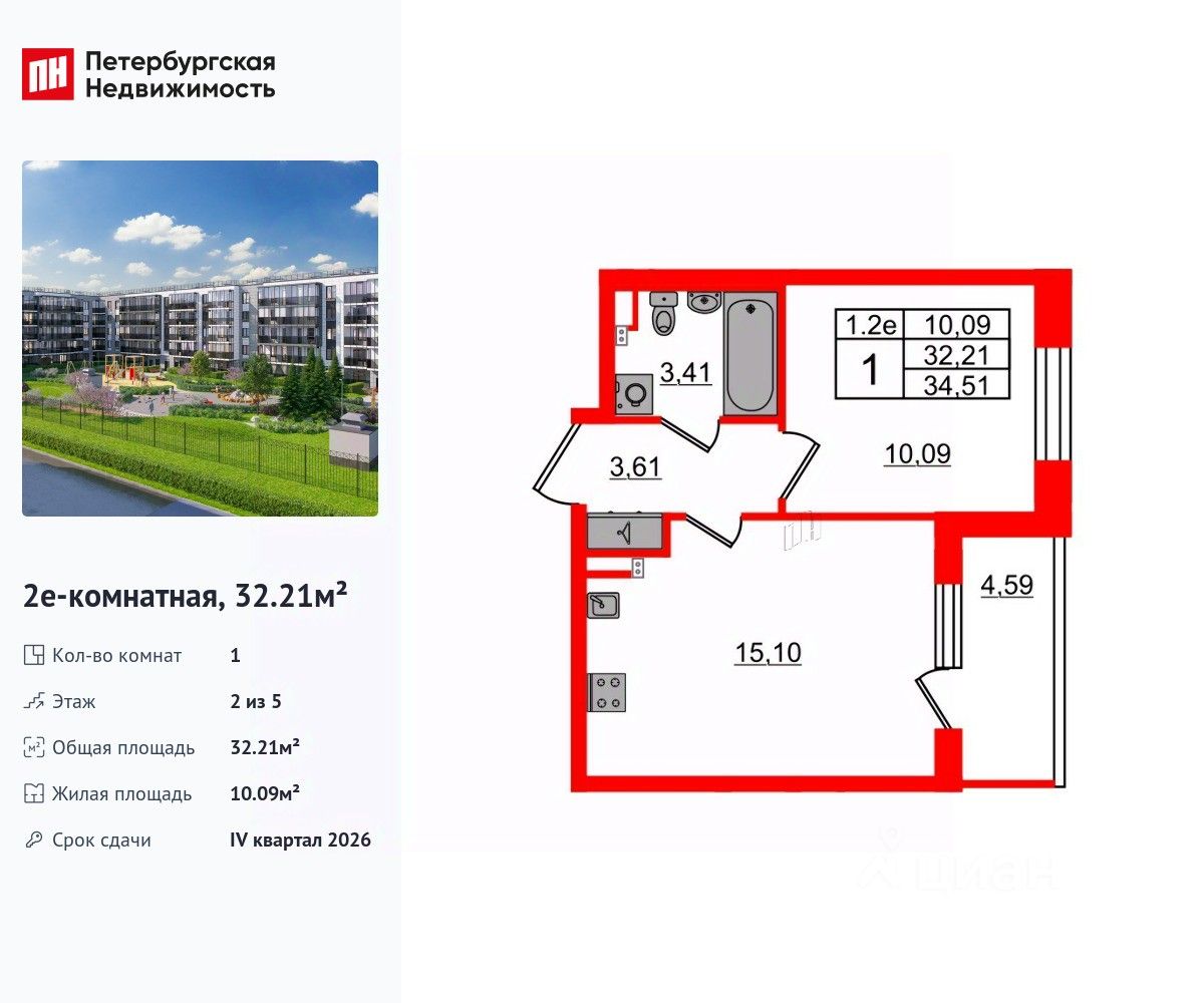 Удобная, классическая, функциональная европланировка, большая кухня-гостиная 15.1 м², вместительная прихожая 3.61 м². Общая площадь квартиры - 32.21 м², жилая 10.09 м², высота потолка 2.77 м.