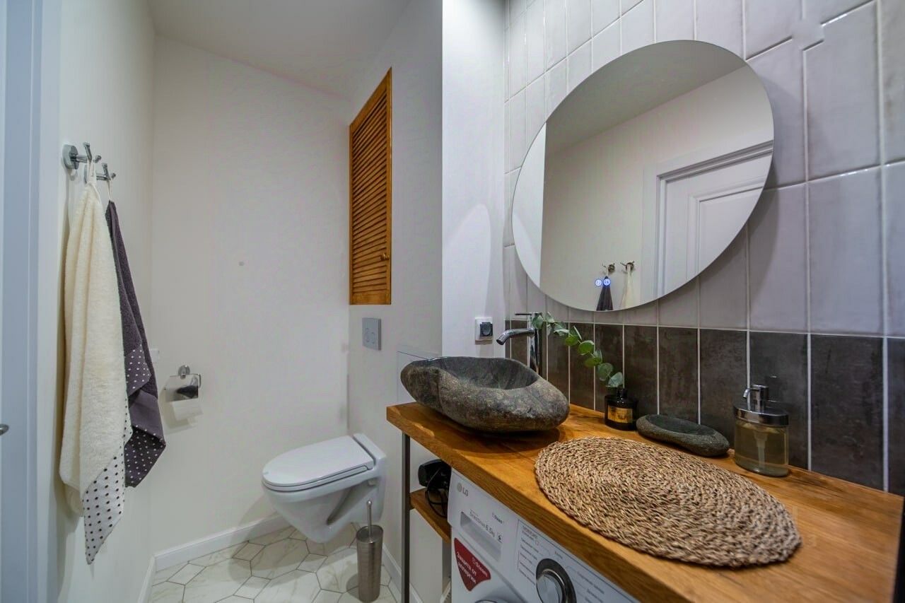 WiFi, SmаrtТV, спальная комната с большой двуспальной кроватью, кухня-гостинная оборудованная бытовой техникой и посудой, посудомоечная машина, стиральная машина, фен, утюг, полотенца и все прочие предметы удобства и комфорта. Дополнительное спальное место - диван.
