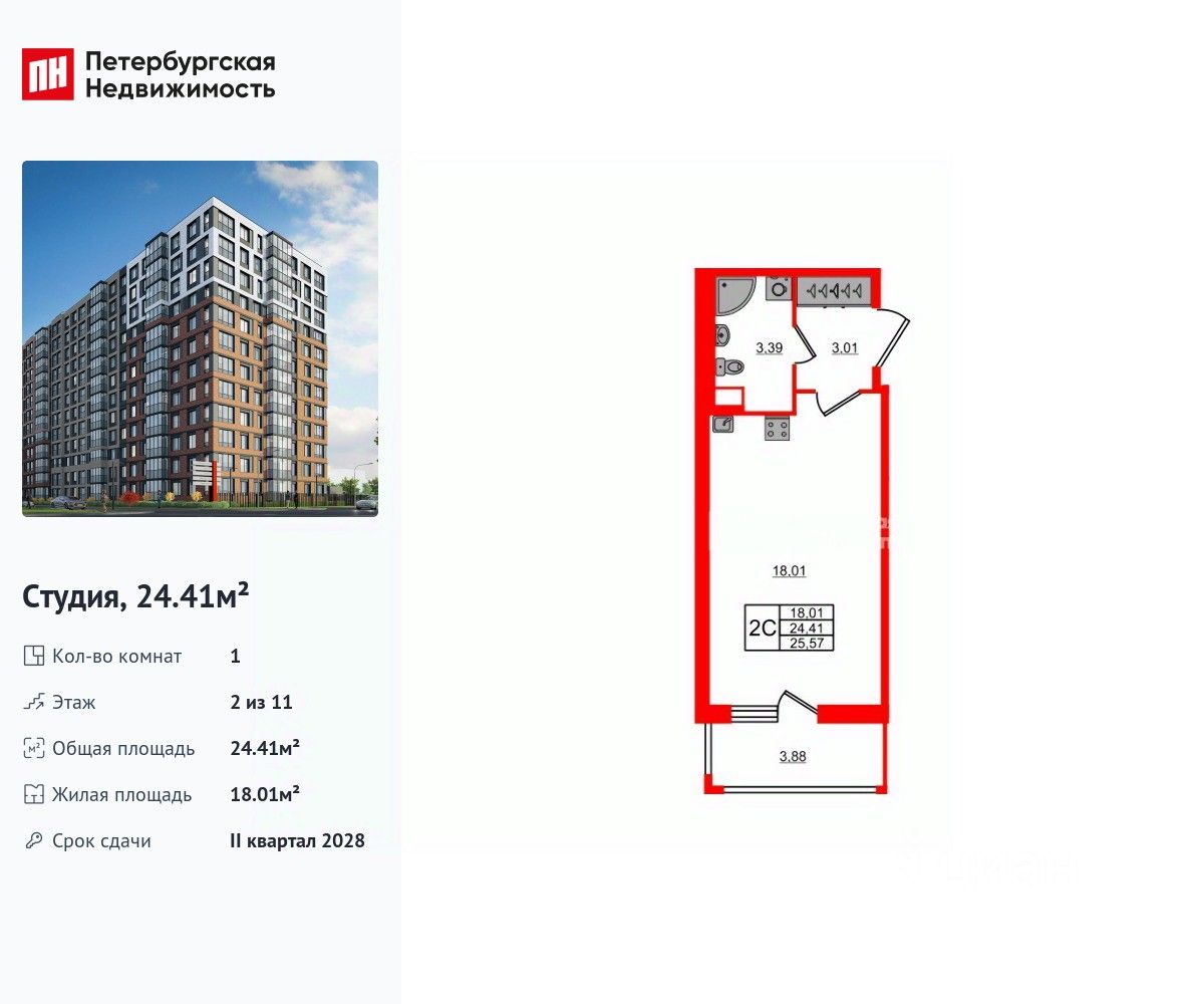 Удобная, классическая, функциональная европланировка, вместительная прихожая 3.01 м². Общая площадь студии - 24.41 м², жилая 18.01 м², высота потолка 2.77 м.
