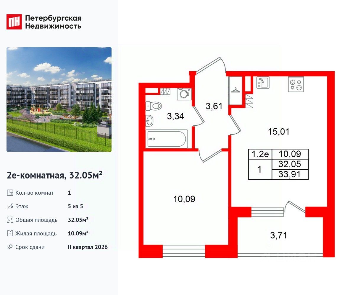 Удобная, классическая, функциональная европланировка, большая кухня-гостиная 15.01 м², вместительная прихожая 3.61 м². Общая площадь квартиры - 32.05 м², жилая 10.09 м², высота потолка 3.07 м.