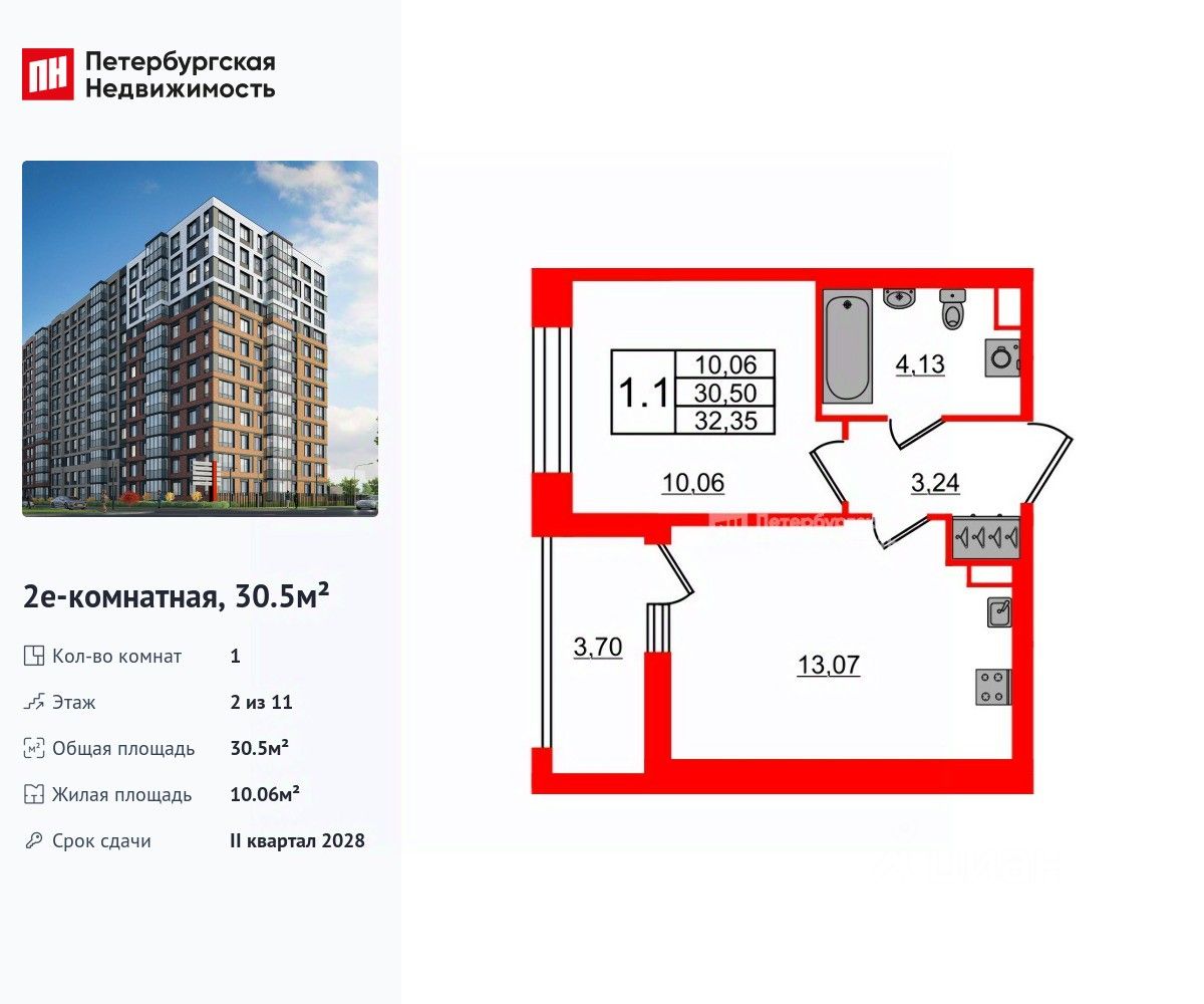 Удобная, классическая, функциональная европланировка, большая кухня-гостиная 13.07 м², вместительная прихожая 3.24 м². Общая площадь квартиры - 30.5 м², жилая 10.06 м², высота потолка 2.77 м.