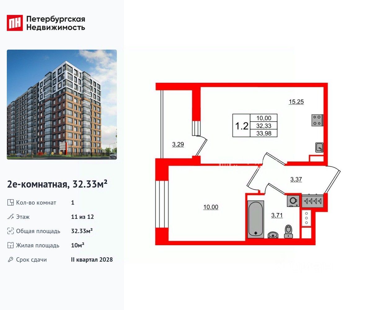Удобная, классическая, функциональная европланировка, большая кухня-гостиная 15.25 м², вместительная прихожая 3.37 м². Общая площадь квартиры - 32.33 м², жилая 10 м², высота потолка 2.77 м.