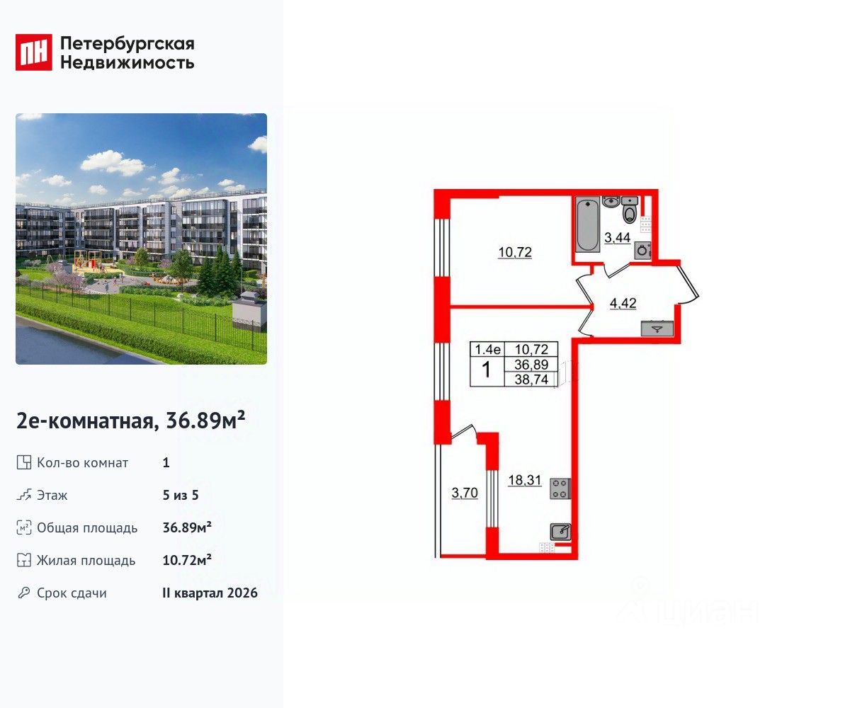 Удобная, классическая, функциональная европланировка, большая кухня-гостиная 18.31 м², просторная прихожая 4.42 м². Общая площадь квартиры - 36.89 м², жилая 10.72 м², высота потолка 3.07 м.