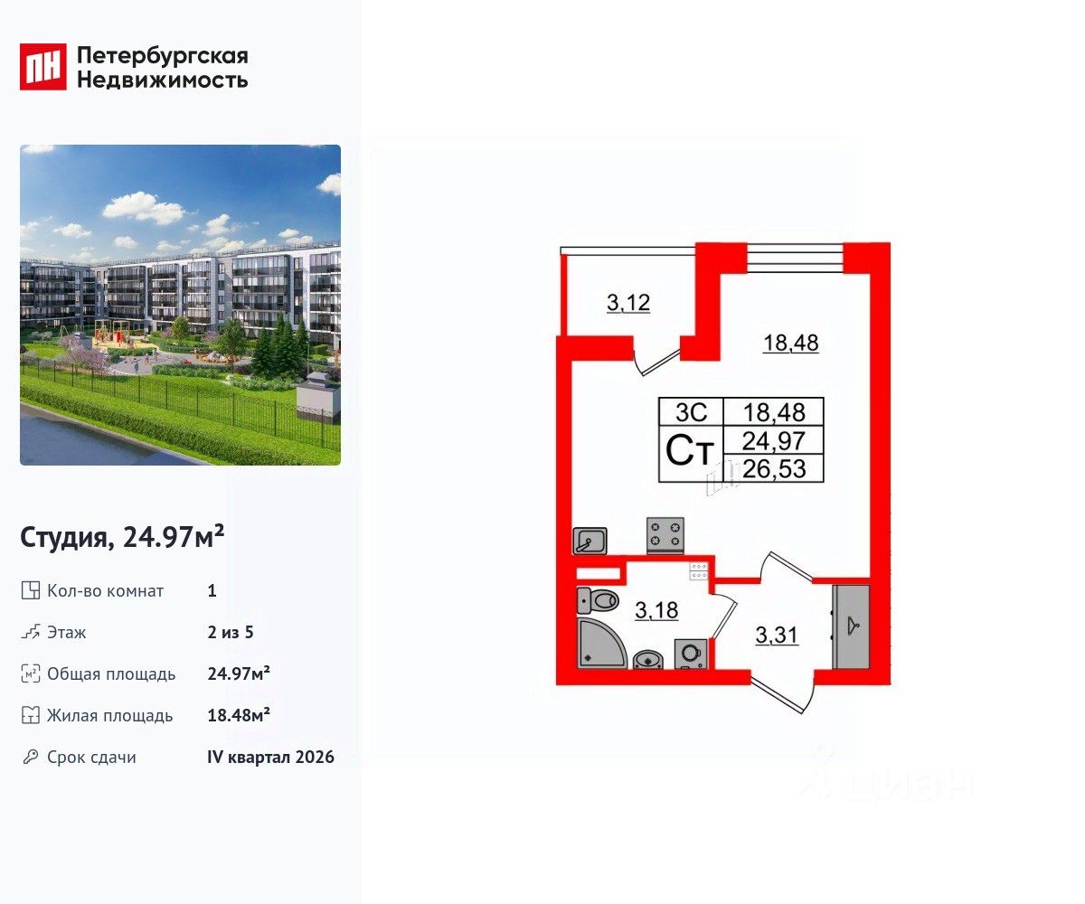 Удобная, классическая, функциональная европланировка, просторная прихожая 3.31 м². Общая площадь студии - 24.97 м², жилая 18.48 м², высота потолка 2.77 м.