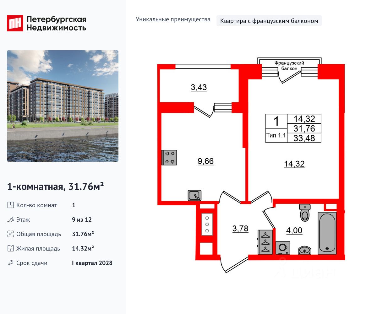 Уникальная планировка, кухня 9.66 м², вместительная прихожая 3.78 м². Общая площадь квартиры - 31.76 м², жилая 14.32 м², высота потолка 2.77 м.