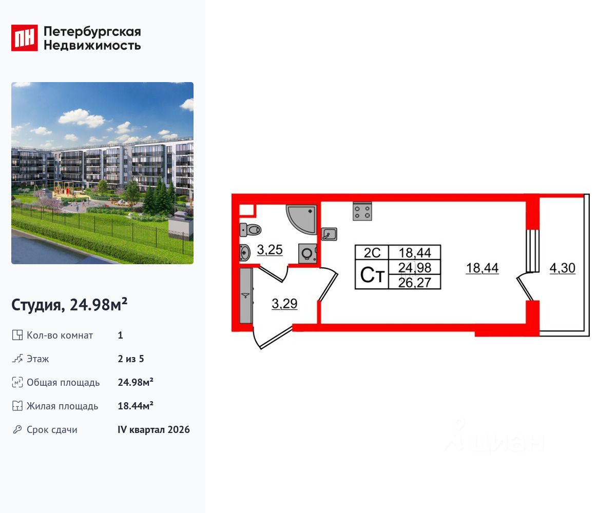 Удобная, классическая, функциональная европланировка, просторная прихожая 3.29 м². Общая площадь студии - 24.98 м², жилая 18.44 м², высота потолка 2.77 м.
