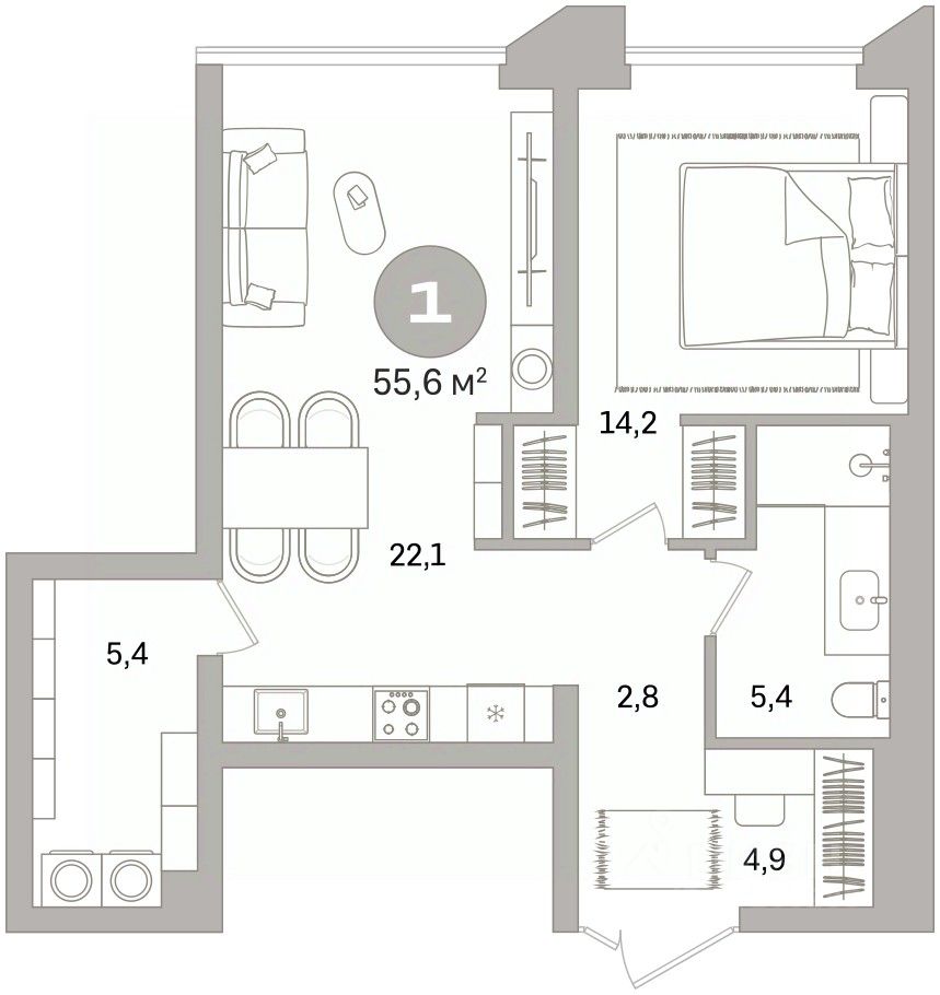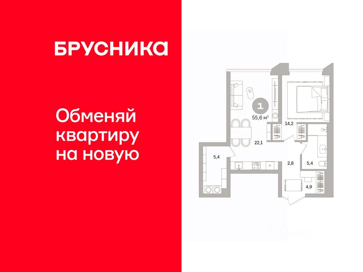 Просторная 1-комн. квартира с предчистовой отделкой в ЖК ''Гоголя 21'' на 7 этаже. Общая площадь: 55.57 кв.м., жилая: 14.2 кв.м., площадь просторной кухни-столовой: 22.1 кв.м. Все окна выходят на одну сторону. В квартире один совмещенный санузел. Высота потолков 2.98 м.