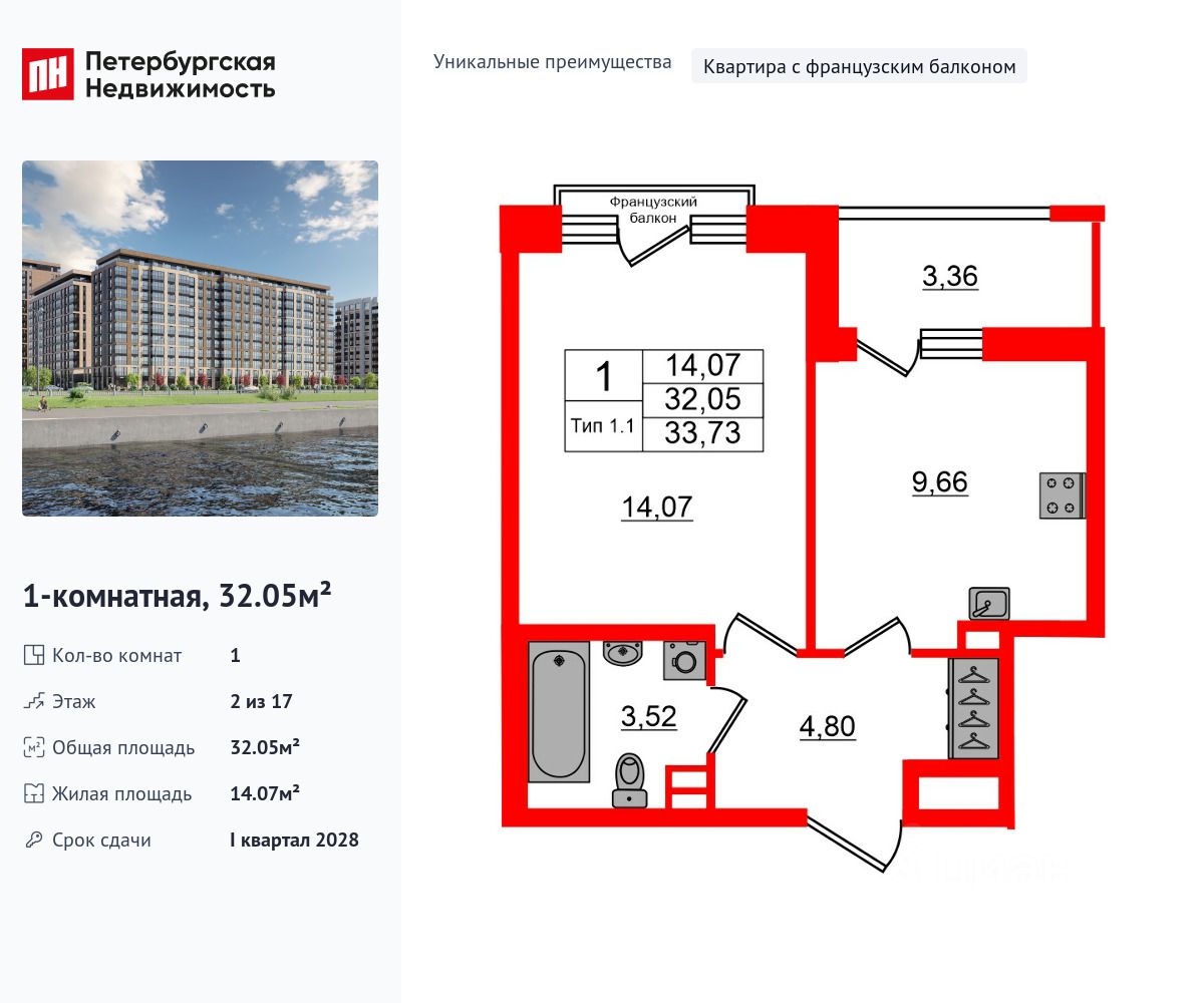 Уникальная планировка, кухня 9.66 м², просторная прихожая 4.8 м². Общая площадь квартиры - 32.05 м², жилая 14.07 м², высота потолка 2.77 м.