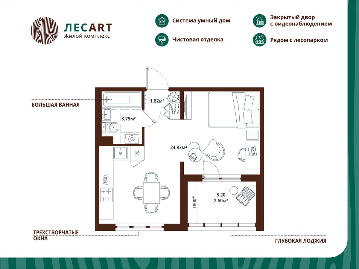 РАСПОЛОЖЕНИЕ И БЛАГОУСТРОЙСТВО Расположение ЖК ''ЛесART'' порадует любителей чистого воздуха — рядом находятся лесопитомник и Шунгеровский заказник. Особенность комплекса это его ART дворы, которые оформлены по мотивам произведений Василия Кандинского, Пита Мондриана и Пабло Пикассо. Дворы закрыты от машин, что обеспечивает безопасность детей и взрослых. Для семей с детьми особенно удобно наличие детского сада и школы прямо во дворе комплекса. На первом этаже расположены магазины, маркетплейсы, кофейни и всё что необходимо для повседневной жизни. Холлы - это продуманные пространства с колясочными, сквозными проходами и приятной музыкой в лифтах. СИСТЕМА УМНОГО ДОМА В КАЖДОЙ КВАРТИРЕ - Комфорт. Управление освещением, мультимедиа и климат-контролем. - Безопасность. Видеонаблюдение и мониторинг систем безопасности. - Экономия. Контроль систем и оптимизация энергопотребления. - Удобство. Управление с помощью мобильного телефона. ГК ''ЕДИНО'' Входит в тройку компаний-лидеров региона по потребительским качествам жилых комплексов, объемам ввода жилья и объемам текущего строительства. В цифрах: -23 года на рынке -Более 50 построенных домов -60 000+ счастливых обладателей квартир