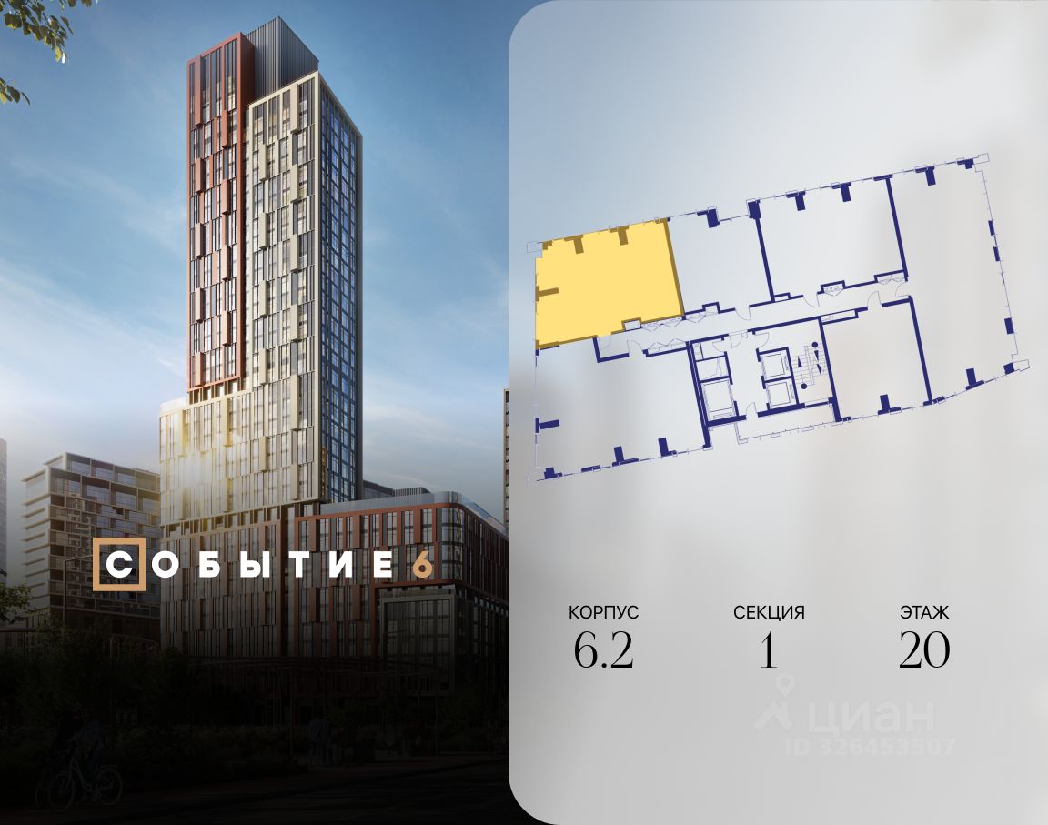 Продаётся 2-комнатная квартира от застройщика: общая площадь 74.60 м², жилая 28.40 м², кухня 26.30 м², 20-й этаж, жилой квартал ''Событие-6'', корпус 2 (секция 1) Срок сдачи: 1 квартал 2029 года.