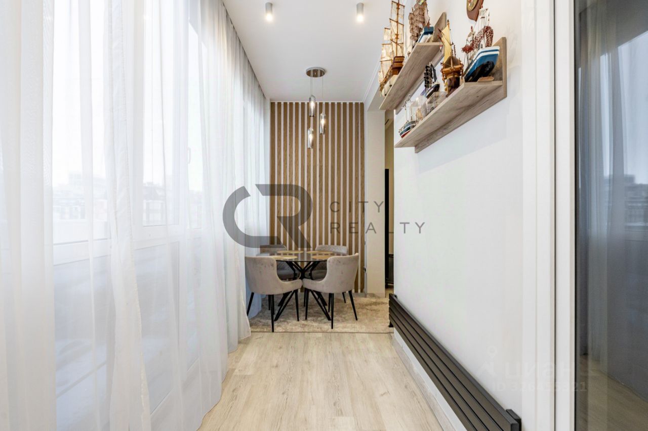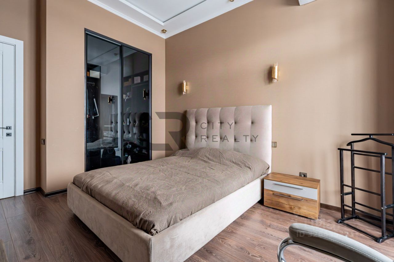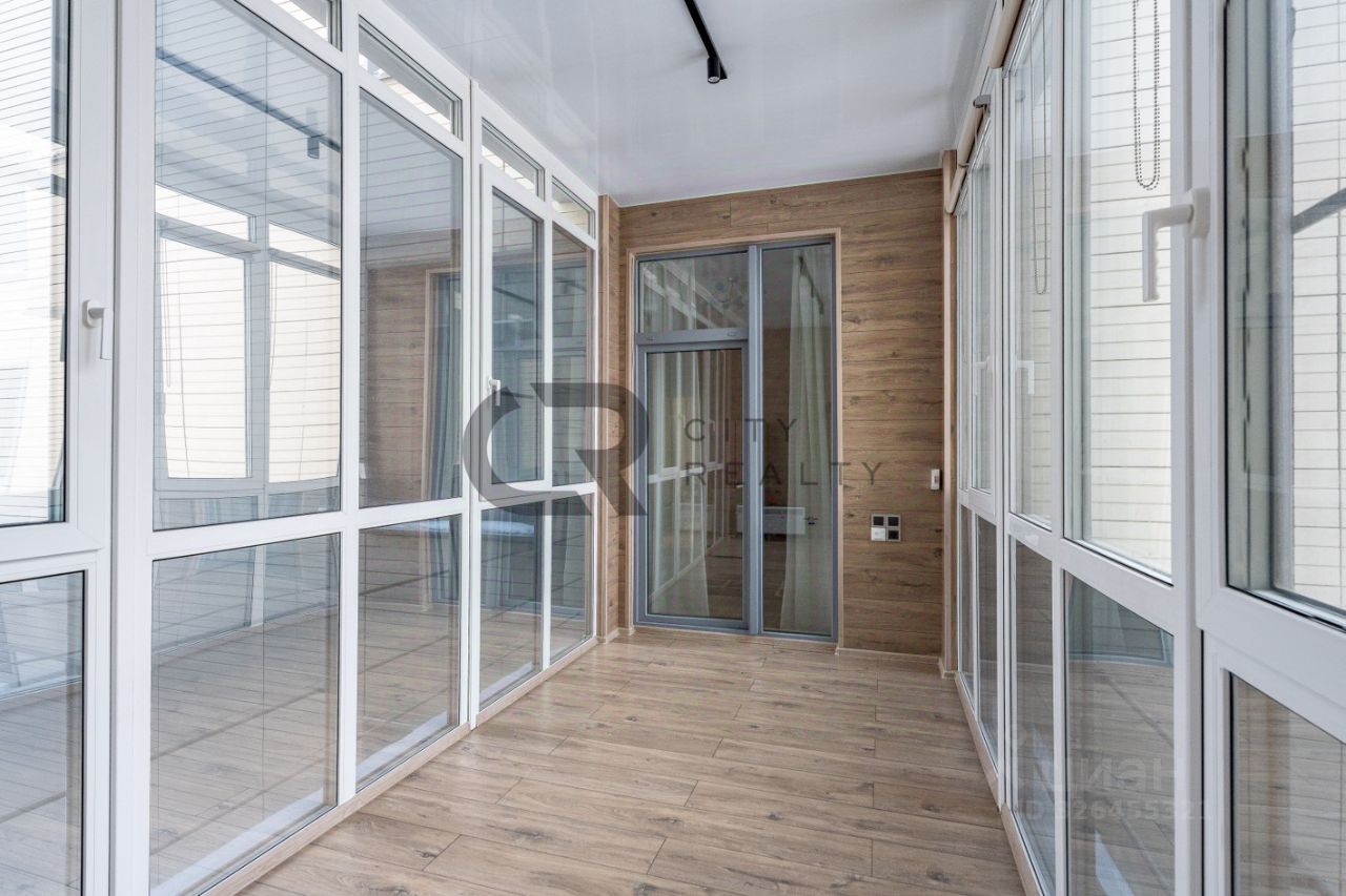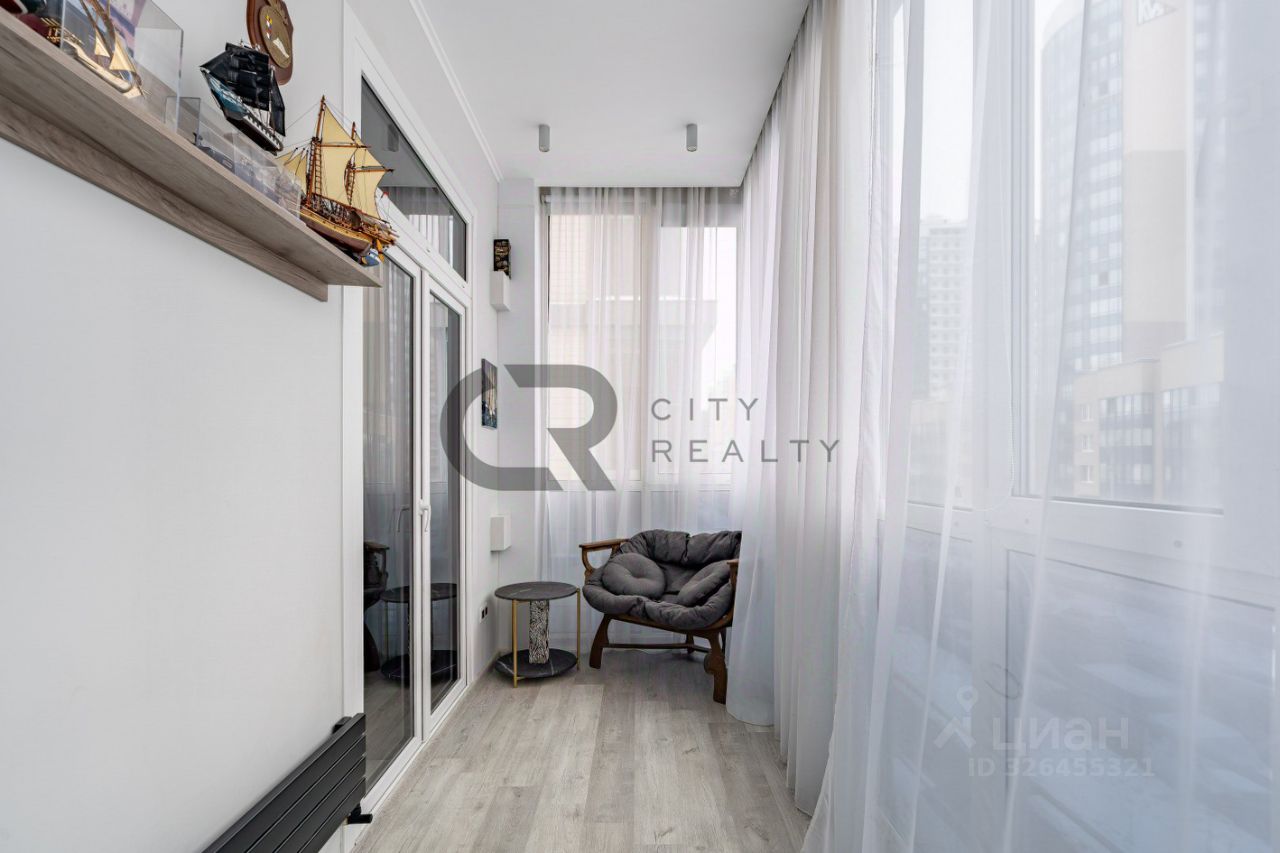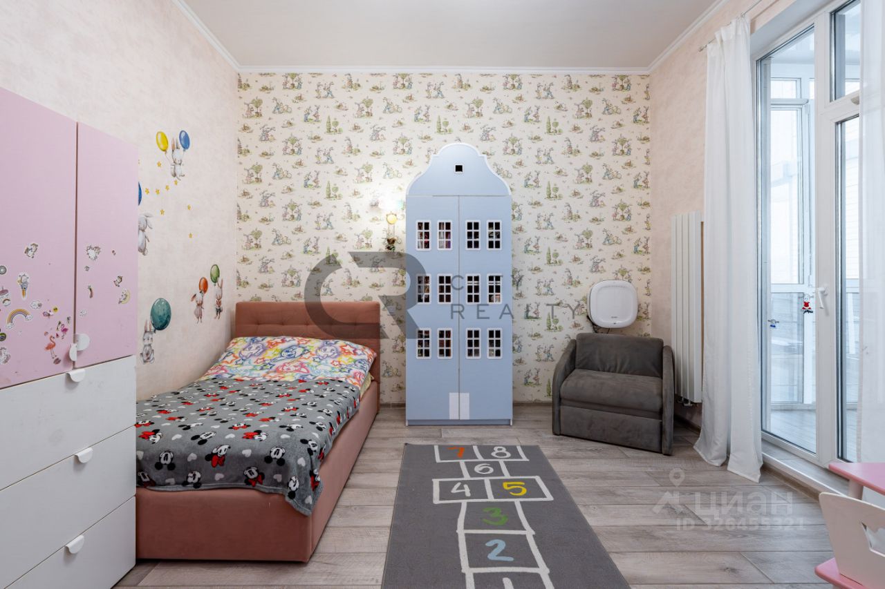 О квартире: • Выполнен стильный ремонт по дизайн-проекту. • Функциональная двусторонняя планировка: изолированные комнаты 18 и 17 метров, спальня с гардеробной и детская. • Просторная кухня-гостиная с зоной столовой, полностью укомплектованная мебелью и бытовой техникой. • Утепленная лоджия 12 метров и балкон с панорамным остеклением, выходящий во двор. • Просторная прихожая со встроенной вместительной системой хранения и гардеробной комнатой. • Два санузла , полноценная ванная.
