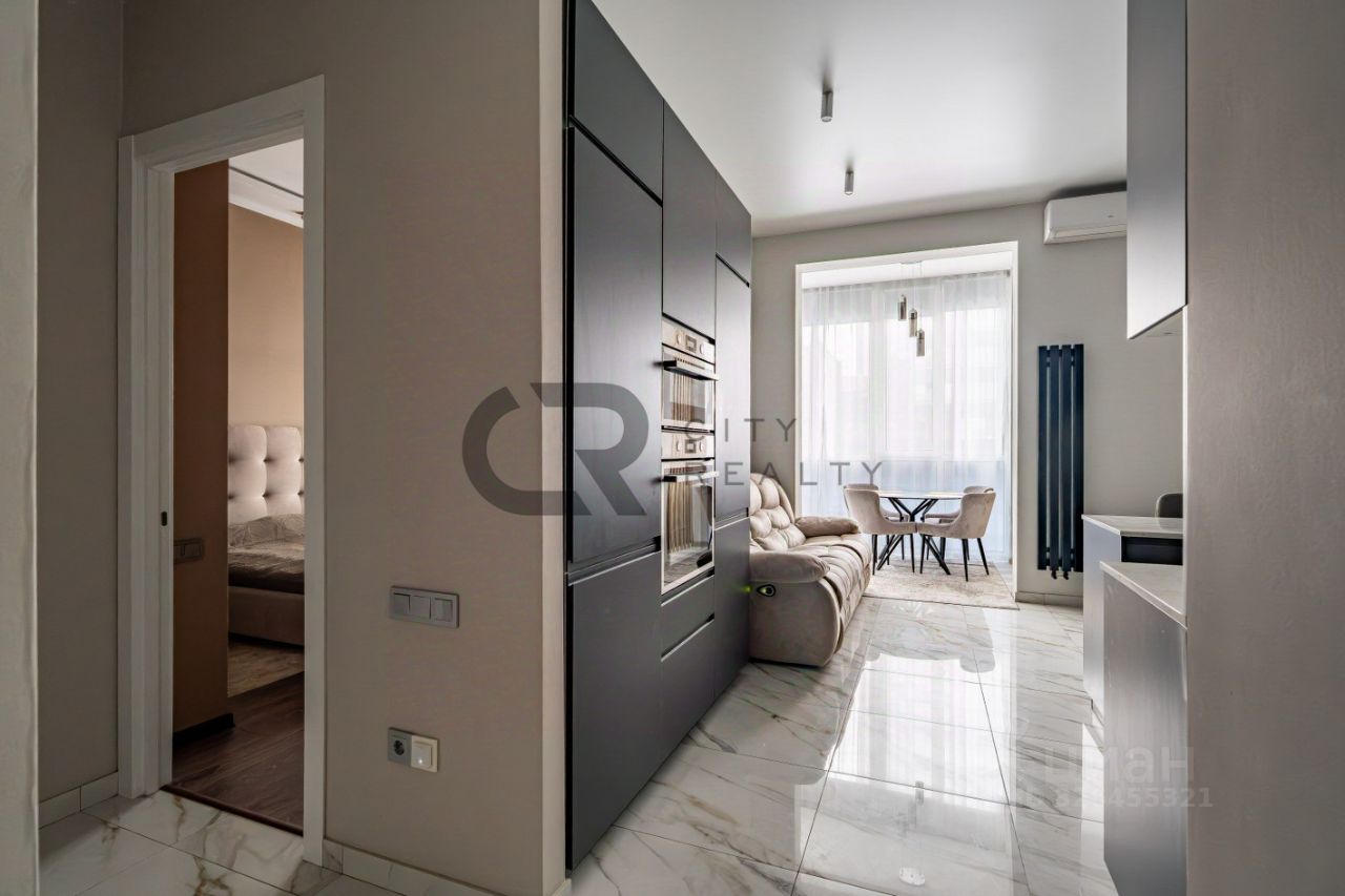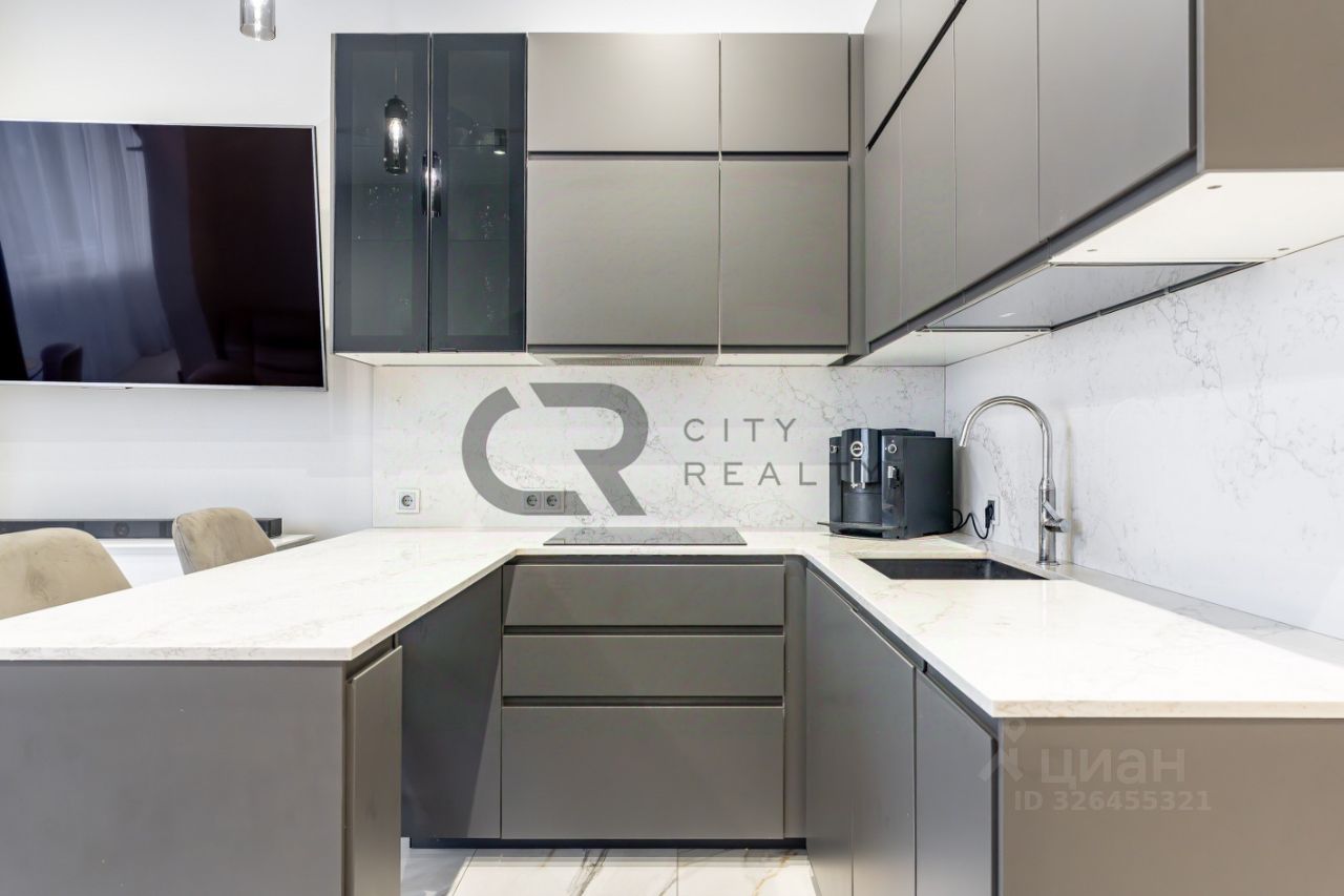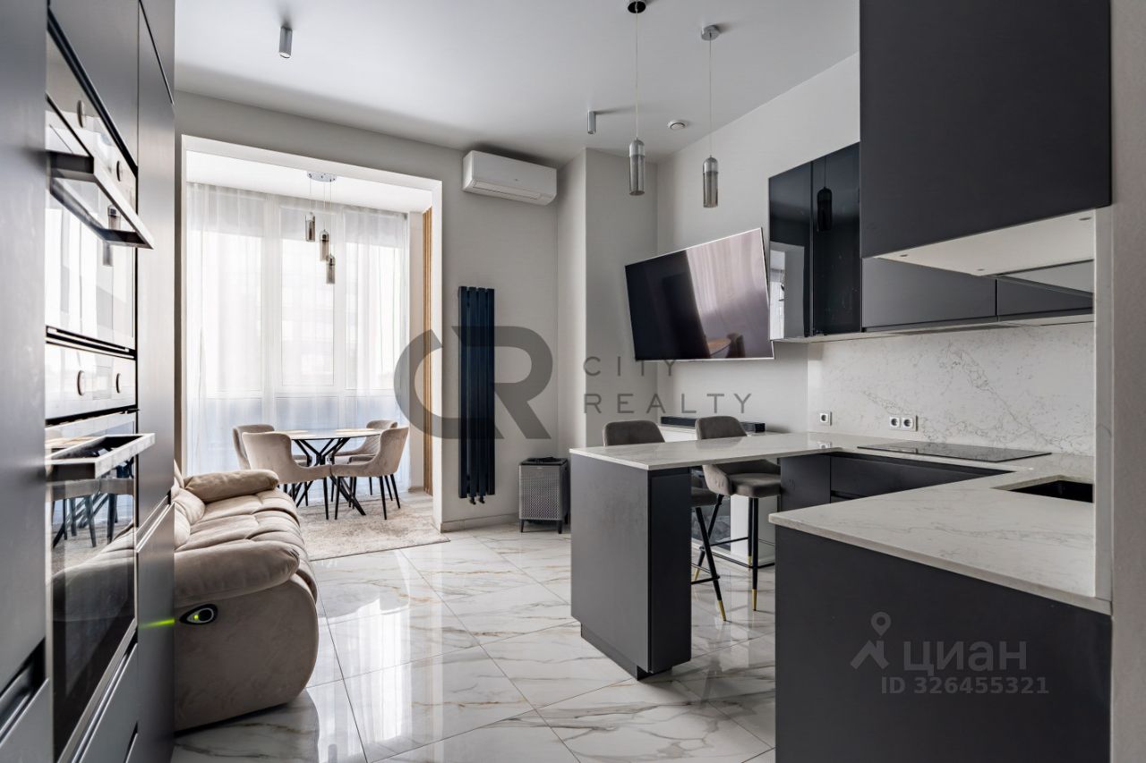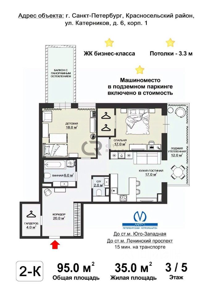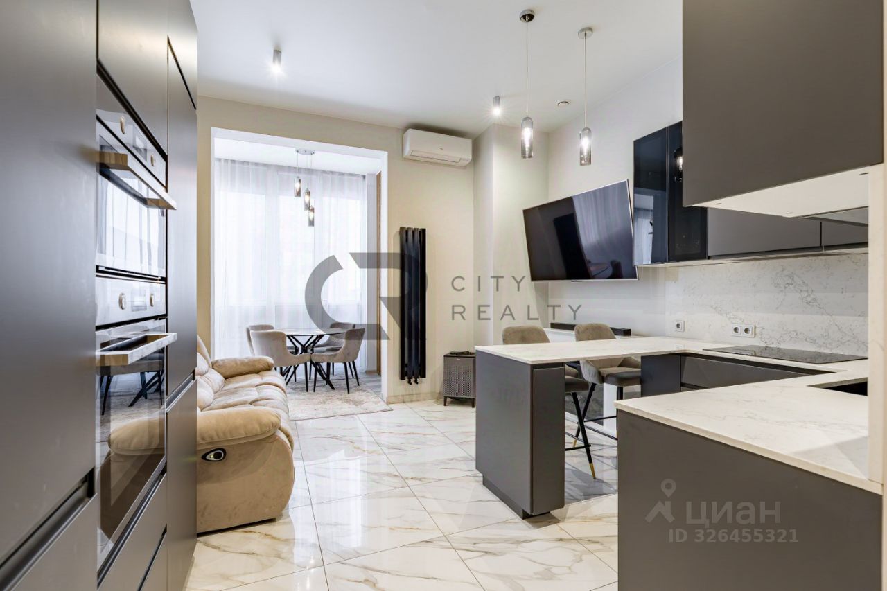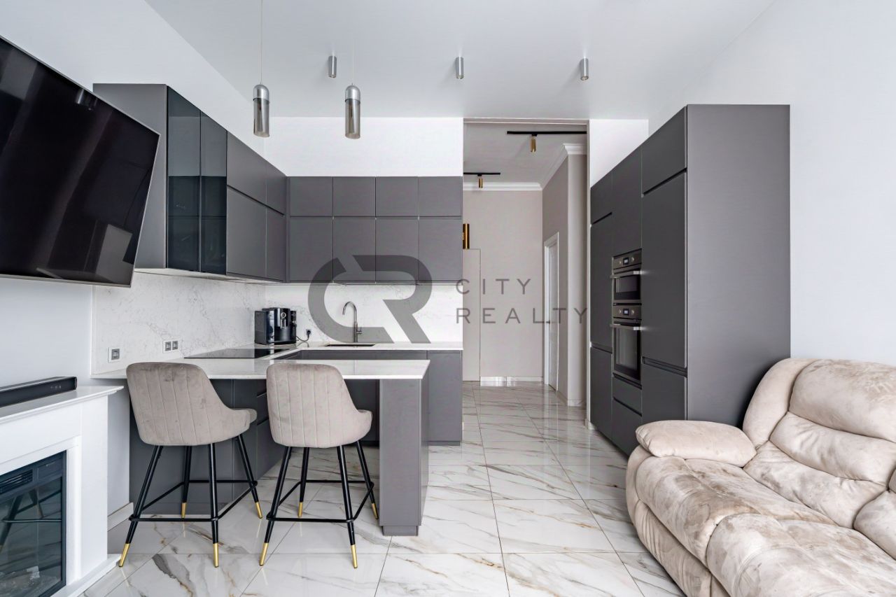 О квартире: • Выполнен стильный ремонт по дизайн-проекту. • Функциональная двусторонняя планировка: изолированные комнаты 18 и 17 метров, спальня с гардеробной и детская. • Просторная кухня-гостиная с зоной столовой, полностью укомплектованная мебелью и бытовой техникой. • Утепленная лоджия 12 метров и балкон с панорамным остеклением, выходящий во двор. • Просторная прихожая со встроенной вместительной системой хранения и гардеробной комнатой. • Два санузла , полноценная ванная.