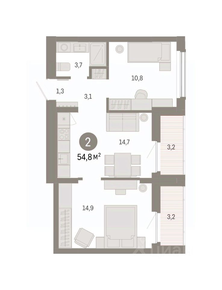 Общая площадь54,83 м2