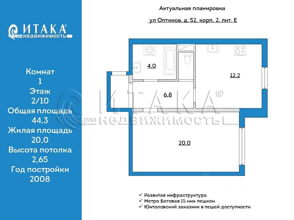 1-92729 Предлагаем к покупке большую 1 к.квартиру 44,3 кв.м. в 15 мин. пешкoм от м.Бегoвая в Примоpcком paйoнe Cанкт-Петербуpга.