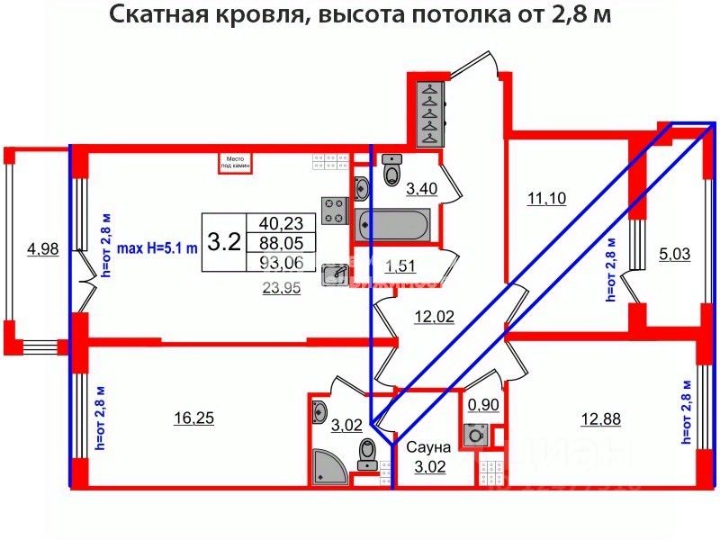 Площадь квартиры — 87,2 м2. Продуманная 4Е-квартира имеет удобную планировку: кухню-гостиную 23,95 м2 с панорамными окнами, остеклённую лоджию и вывод под камин , две комнаты 12.88м2 и 11.10м2, мастер - спальню 16.26м2 с собственным санулом и сауной 6.04 м2, прачечную 0.90 м2, кладовую 1.51 м2, гостевой санузел 3.40 м, вместительный коридор 10.99 м2. Потолки высотой до 5,1 м создают ощущение объёма и наполняют пространство светом. В квартире предусмотрены прачечная, кладовая, два санузла и две остеклённые лоджии. Особое преимущество — мастер-спальня с собственной сауной. Выполнена современная качественная отделка. Есть вывод под камин и возможность его установки — редкая и статусная опция для городской квартиры.
