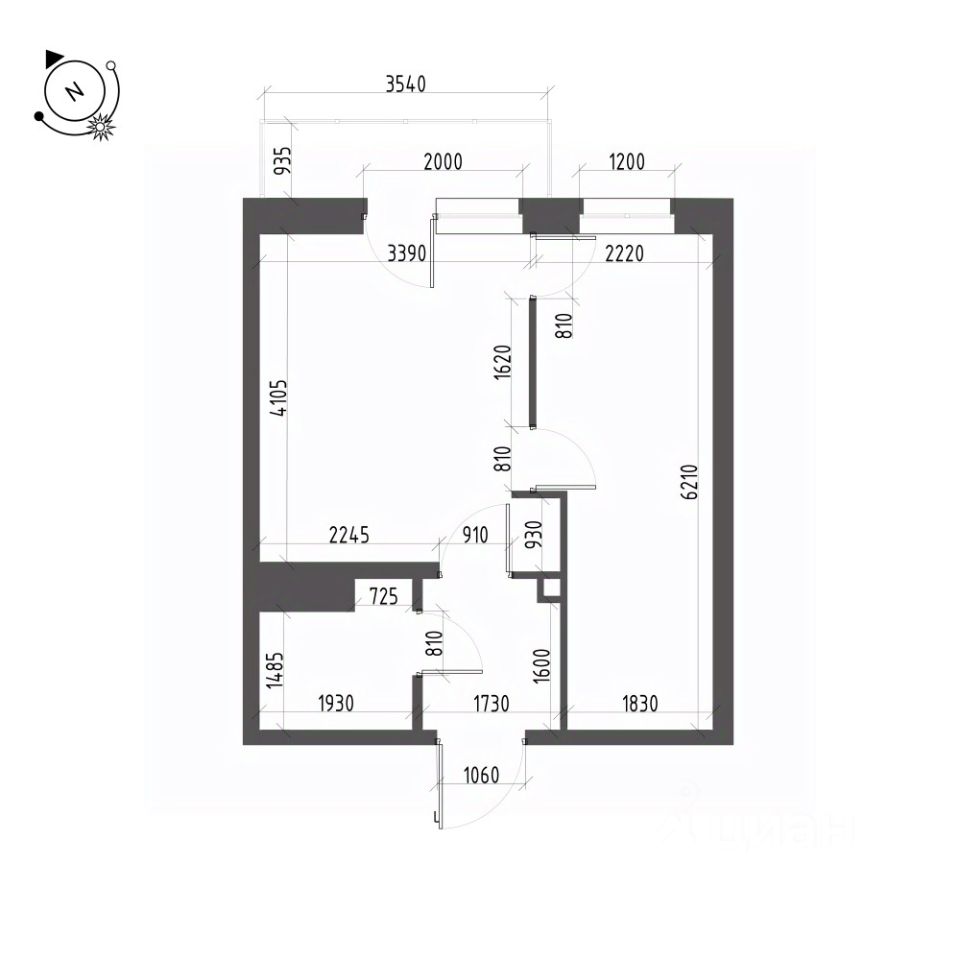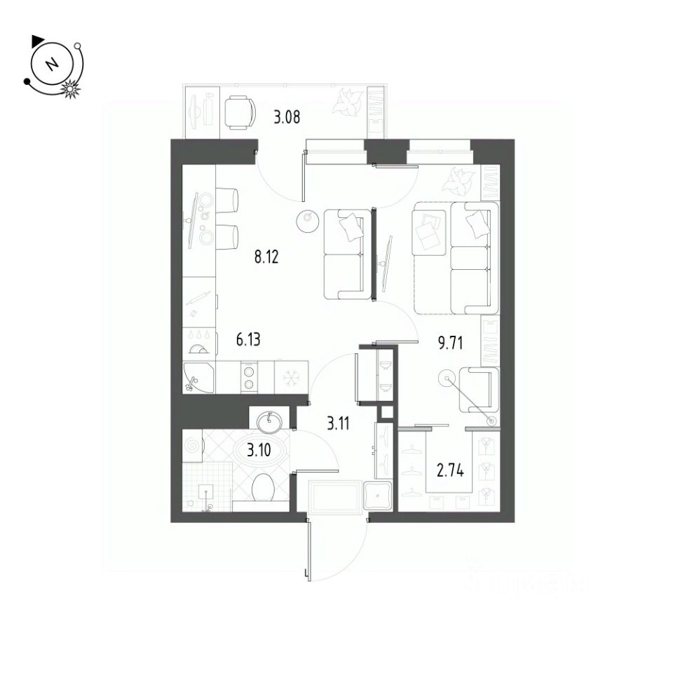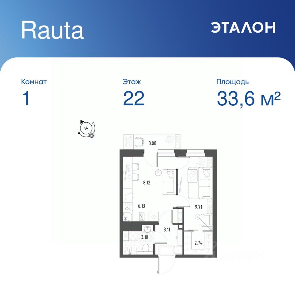 Общая площадь квартиры — 33.6 кв. м, этаж 22 из 22.