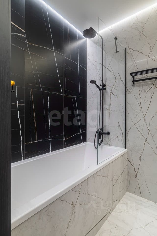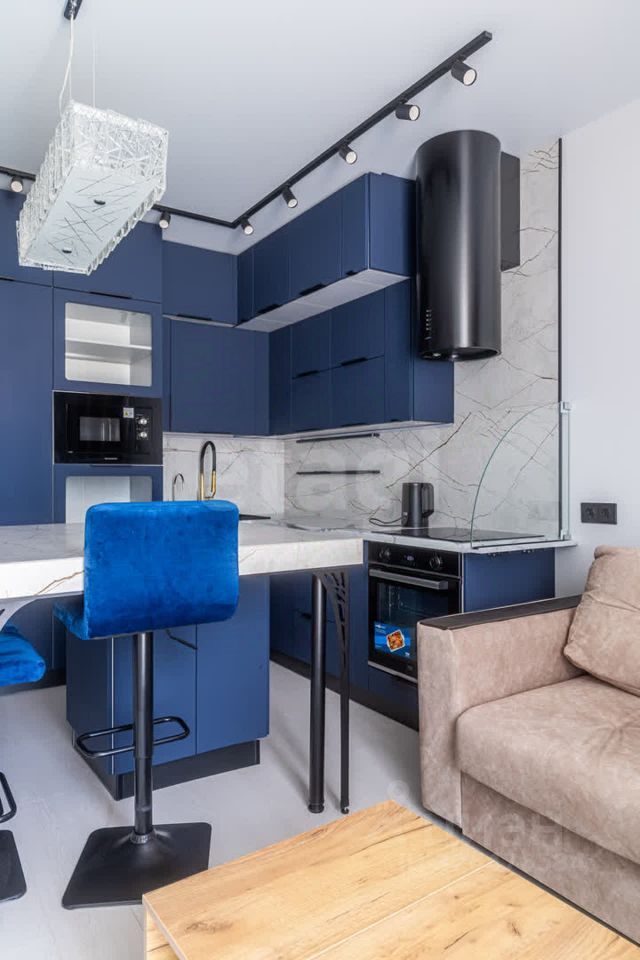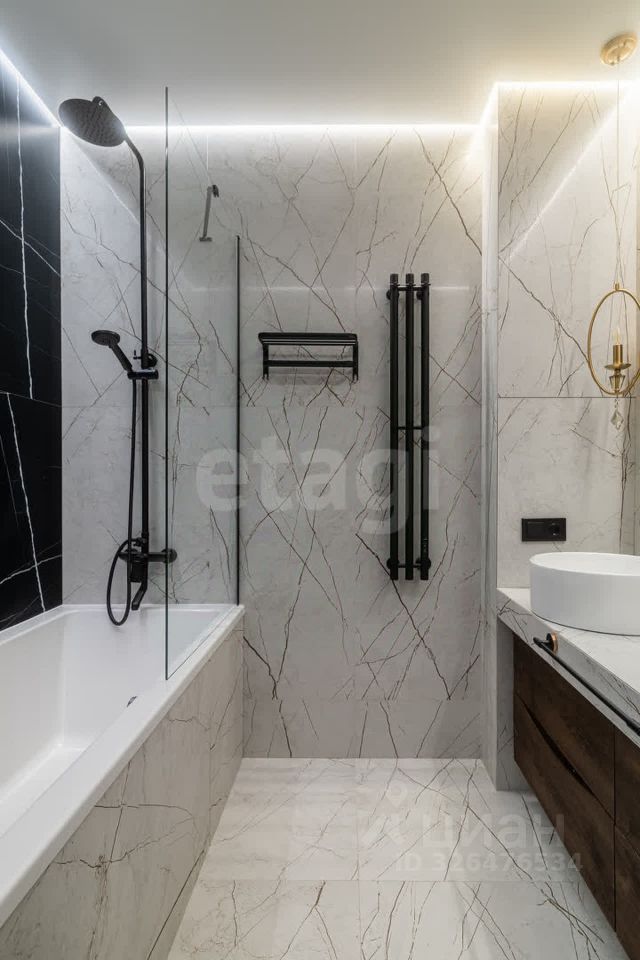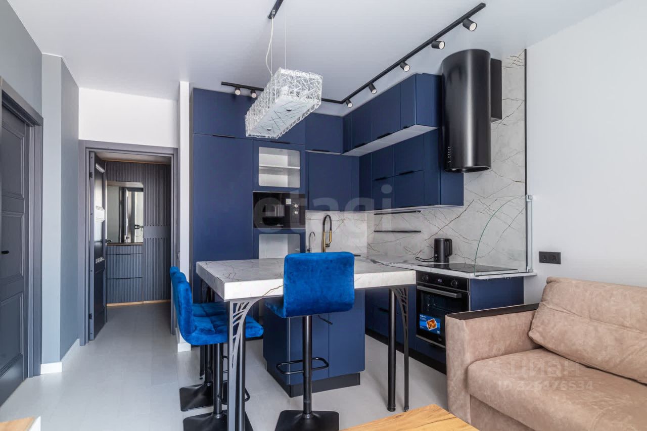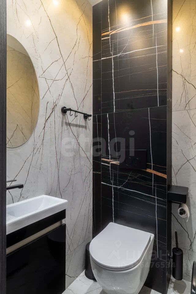 Яркое освещение с трековой системой и стильными люстрами наполняют пространство светом, а раздельный санузел с полноценной ванной добавляет комфорта.