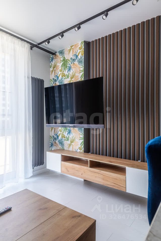 Просторная кухня-гостиная с продуманной системой хранения, современной техникой и уютной зоной отдыха с большим телевизором — здесь приятно готовить, собираться с друзьями или отдыхать после рабочего дня.