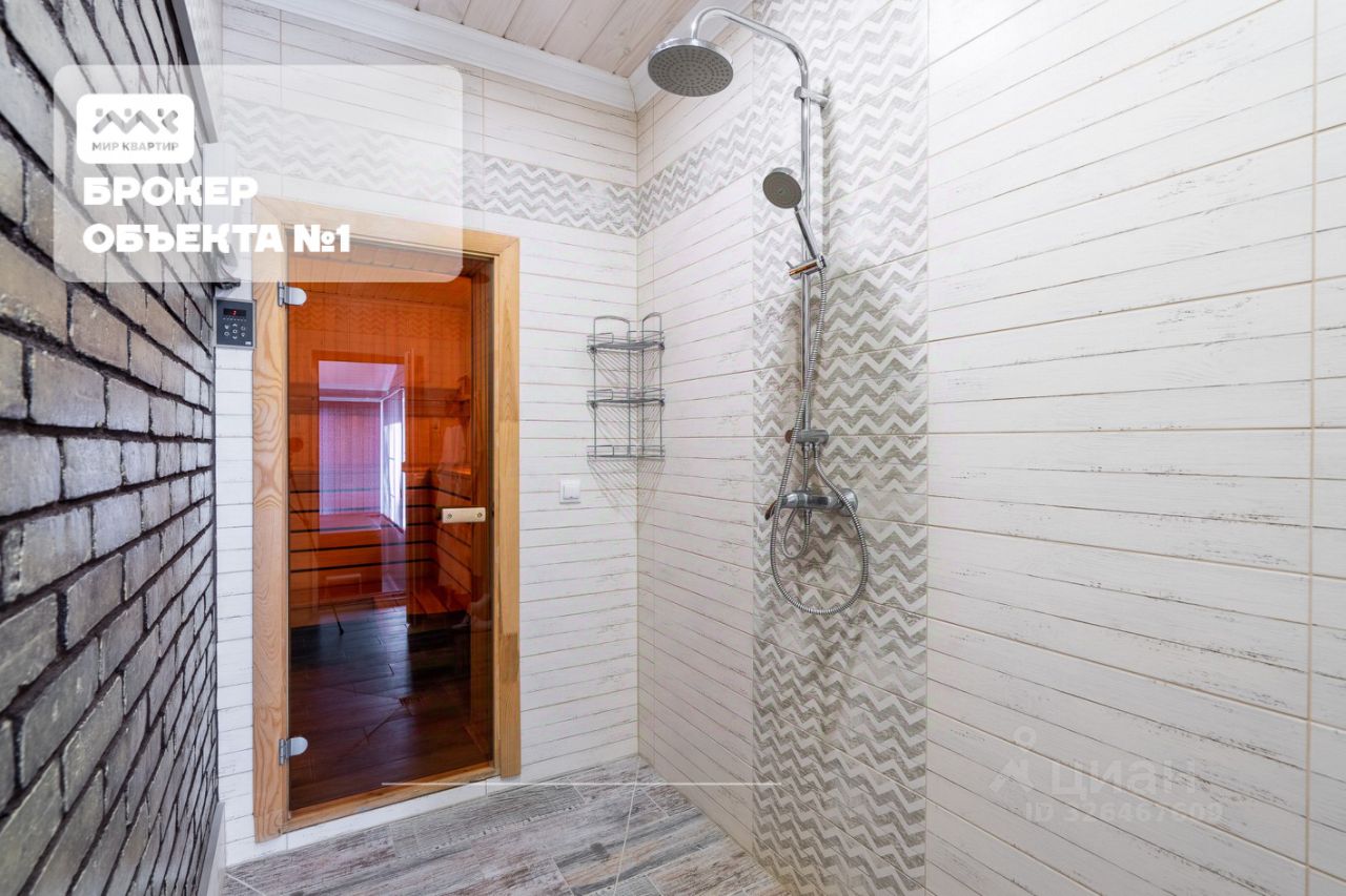 На территории расположено два дома: Первый (основной) дом 250 м2: Стены из бревна, кирпич, обшиты блокхаусом, фундамент - бетонная плита. большая открытая терраса. 1 этаж: гардеробная, гостевая спальня, гостиная с выходом на террасу, кухня, санузел с сауной и застекленная веранда с джакузи.