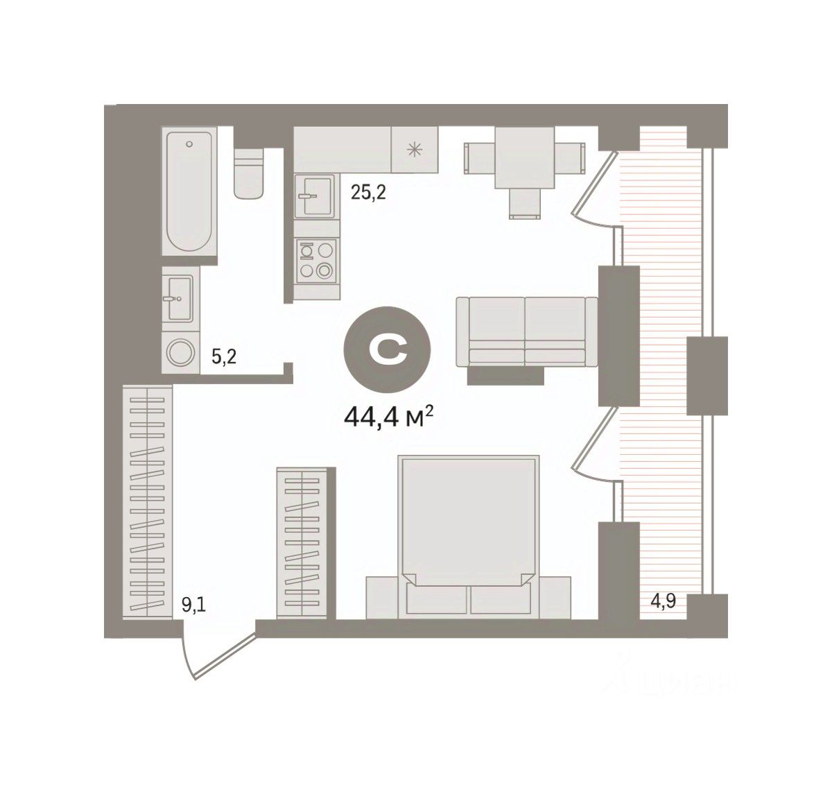 Студия в квартале ''Мылзавод''. Особенности планировки: предчистовая отделка, терраса на крыше. квартиры в нашей базе: МЛ-ГП4.2-9-9.27.1.