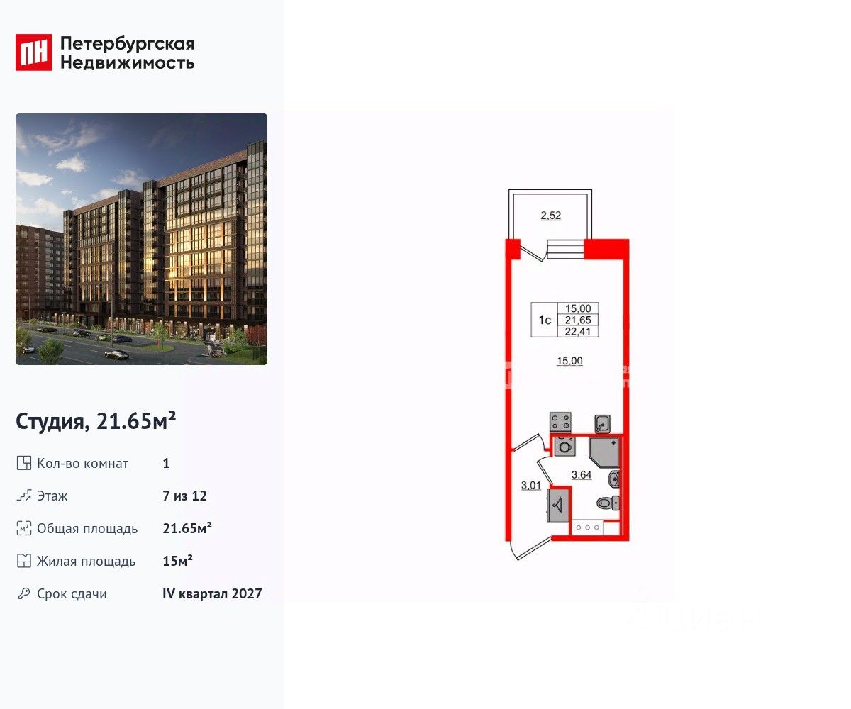 Удобная, классическая, функциональная европланировка, вместительная прихожая 3.01 м². Общая площадь студии - 21.65 м², жилая 15 м², высота потолка 2.75 м.