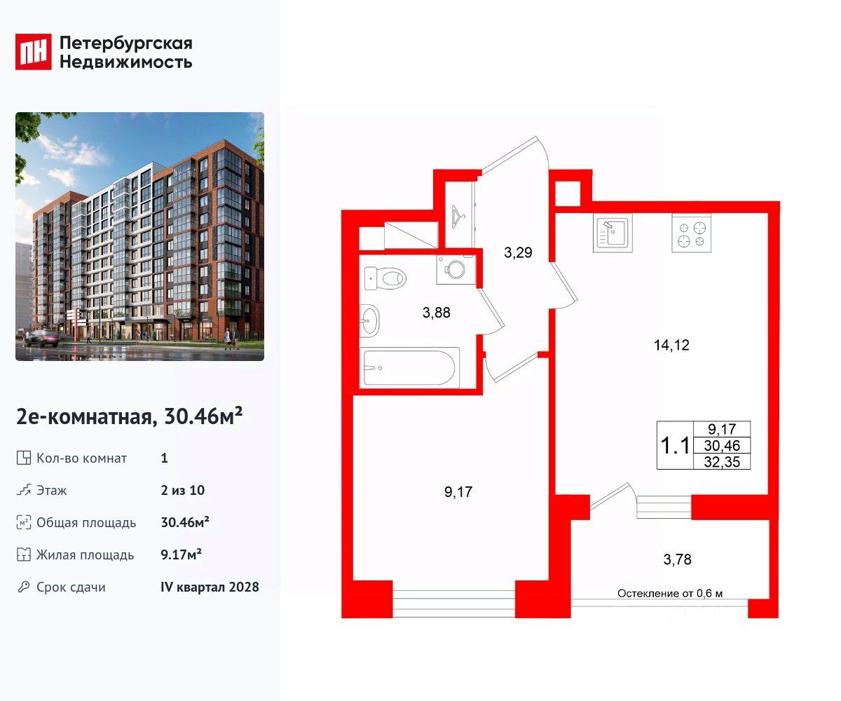 Удобная, классическая, функциональная европланировка, большая кухня-гостиная 14.12 м², вместительная прихожая 3.29 м². Общая площадь квартиры - 30.46 м², жилая 9.17 м², высота потолка 2.77 м.