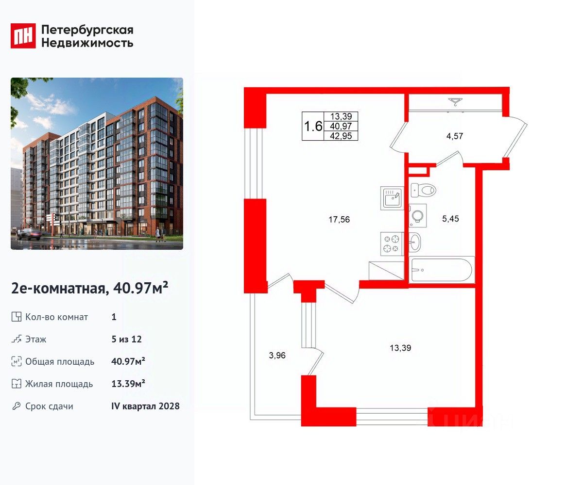 Удобная, классическая, функциональная европланировка, большая кухня-гостиная 17.56 м², просторная прихожая 4.57 м². Общая площадь квартиры - 40.97 м², жилая 13.39 м², высота потолка 2.77 м.