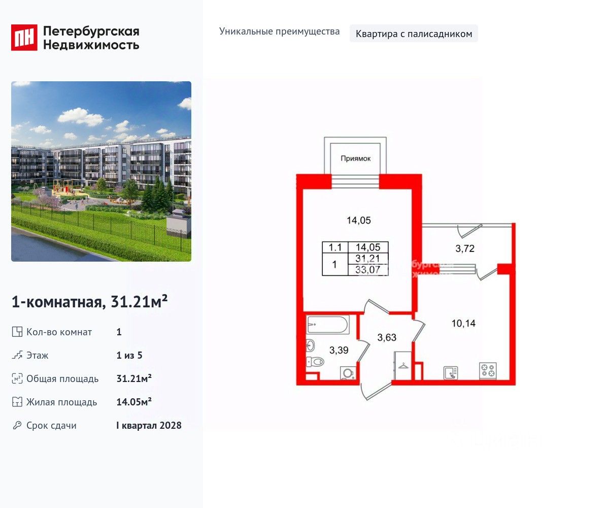 Уникальная планировка, кухня 10.14 м², вместительная прихожая 3.63 м². Общая площадь квартиры - 31.21 м², жилая 14.05 м², высота потолка 2.77 м.