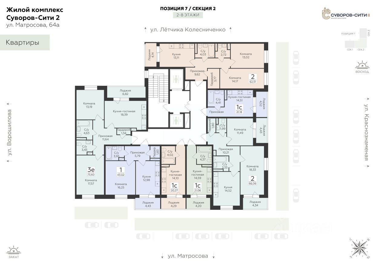 Продаётся 3-комнатная квартира в строящемся доме (Позиция 5, Позиция 7), срок сдачи: II-кв. 2030, общей площадью 73.6 кв.м., на 4 этаже. ''Суворов Сити 2'' - продолжение нашумевшего проекта, который возводится всего в 4 км от исторического центра Воронежа на пересечении улиц Матросова и Ворошилова. Здесь сочетаются выгодное расположение, удобные разнообразные планировки, стильный дизайн фасада, современный безопасный двор и просторные холлы. ''Суворов Сити 2'' - образцовый пример современной архитектуры, когда новый жилой квартал создается в существующем городском окружении максимально деликатно и гармонично. Жилой комплекс ''Суворов Сити 2'' расположен на ул. Матросова - в районе, стремительно меняющем свой облик. Это идеальная точка баланса между спокойствием тихого района и развитой инфраструктурой. Свободный доступ к главным городским автомагистралям и развязкам позволит быть мобильными и смело прокладывать маршруты в любую точку города - на автомобиле или общественном транспорте. Здесь проходит большое количество маршрутов общественного транспорта, что обеспечивает комфортный доступ в любую точку города. Инфраструктура В нескольких минутах езды от жилого комплекса находятся школы и детские сады. Вам не придется тратить много времени на длительные поездки и терять драгоценное время в пробках. Но, самое главное, что в скором времени на территории жилого комплекса появится детский сад.