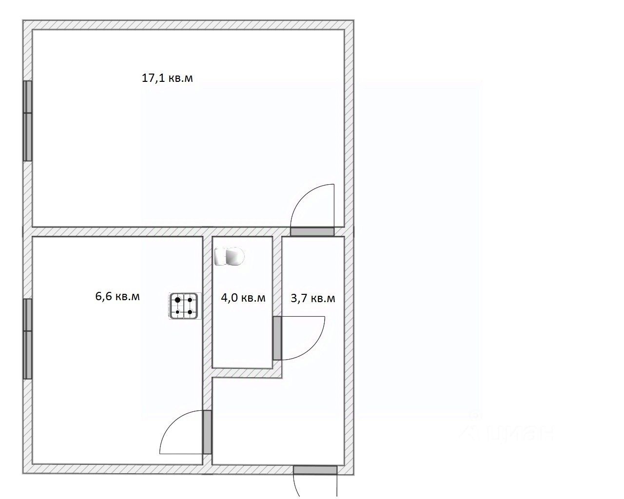 Общая площадь: 31,4 кв. м. Планировка: Классическая, жилая, очень светлая. Состояние: Готова к заселению. Идеальная база для косметического ремонта под ваш вкус. Особенности: Все удобства в доме. Один собственник, нет долгов по ЖКУ, никаких обременений. Преимущества: