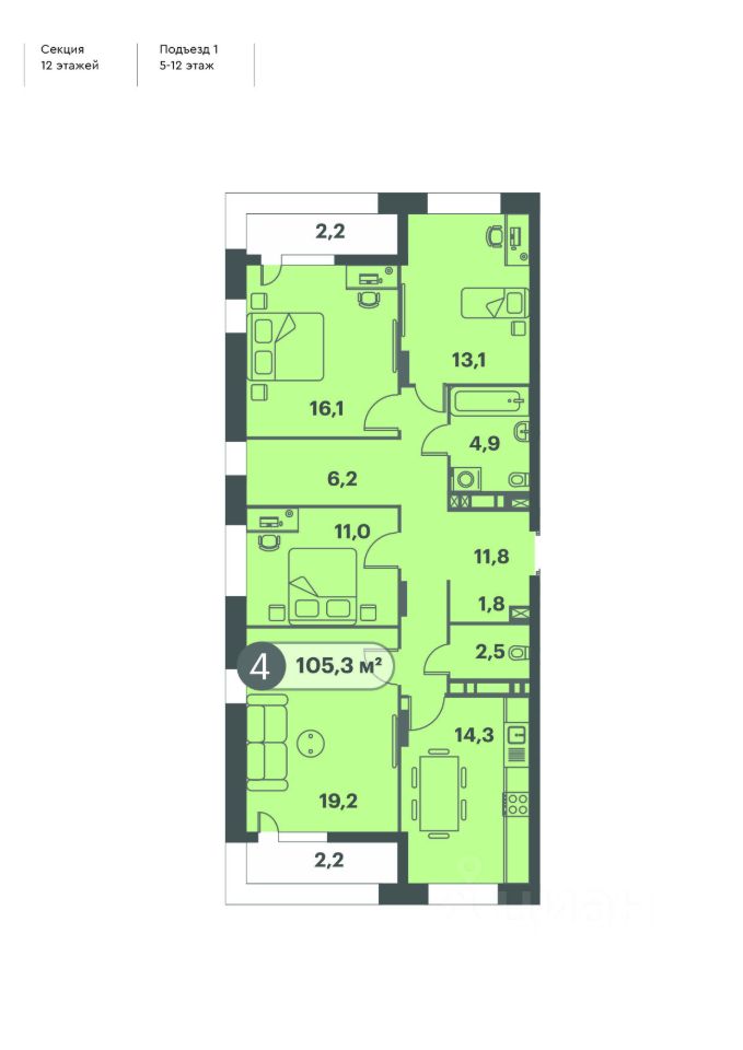 Продаётся 4-комнатная квартира в строящемся доме (Дом 1), срок сдачи: II-кв. 2026, общей площадью 105.3 кв.м., на 10 этаже. Новый жилой комплекс ''Три Клёна'' от строительной компании ''СибЛидер'' расположен по адресу: г. Красноярск, по ул. Семафорная.