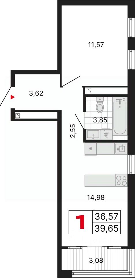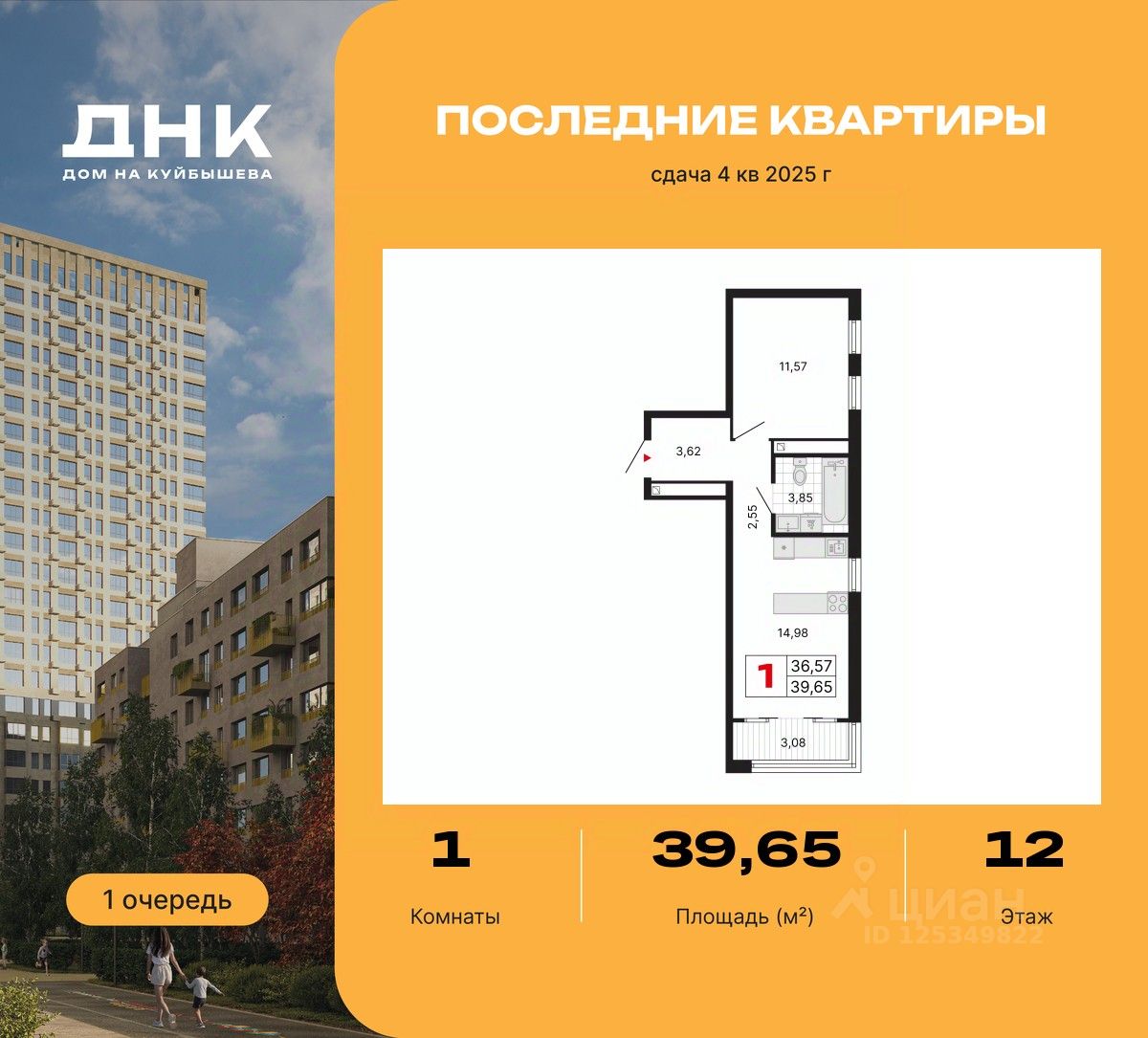 Просторная 1-комн. квартира с отделкой в ЖК ''ДНК. Дом на Куйбышева'' на 12 этаже. Общая площадь: 39.65 кв.м., жилая: 11.57 кв.м., площадь просторной кухни-столовой: 14.98 кв.м. Квартира угловая, идеально подойдет любителям тишины и панорамных видов. В квартире один балкон, один совмещенный санузел. Высота потолков 2.7 м.