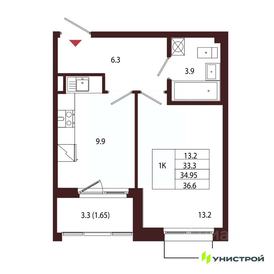 Общая площадь34,95 м2