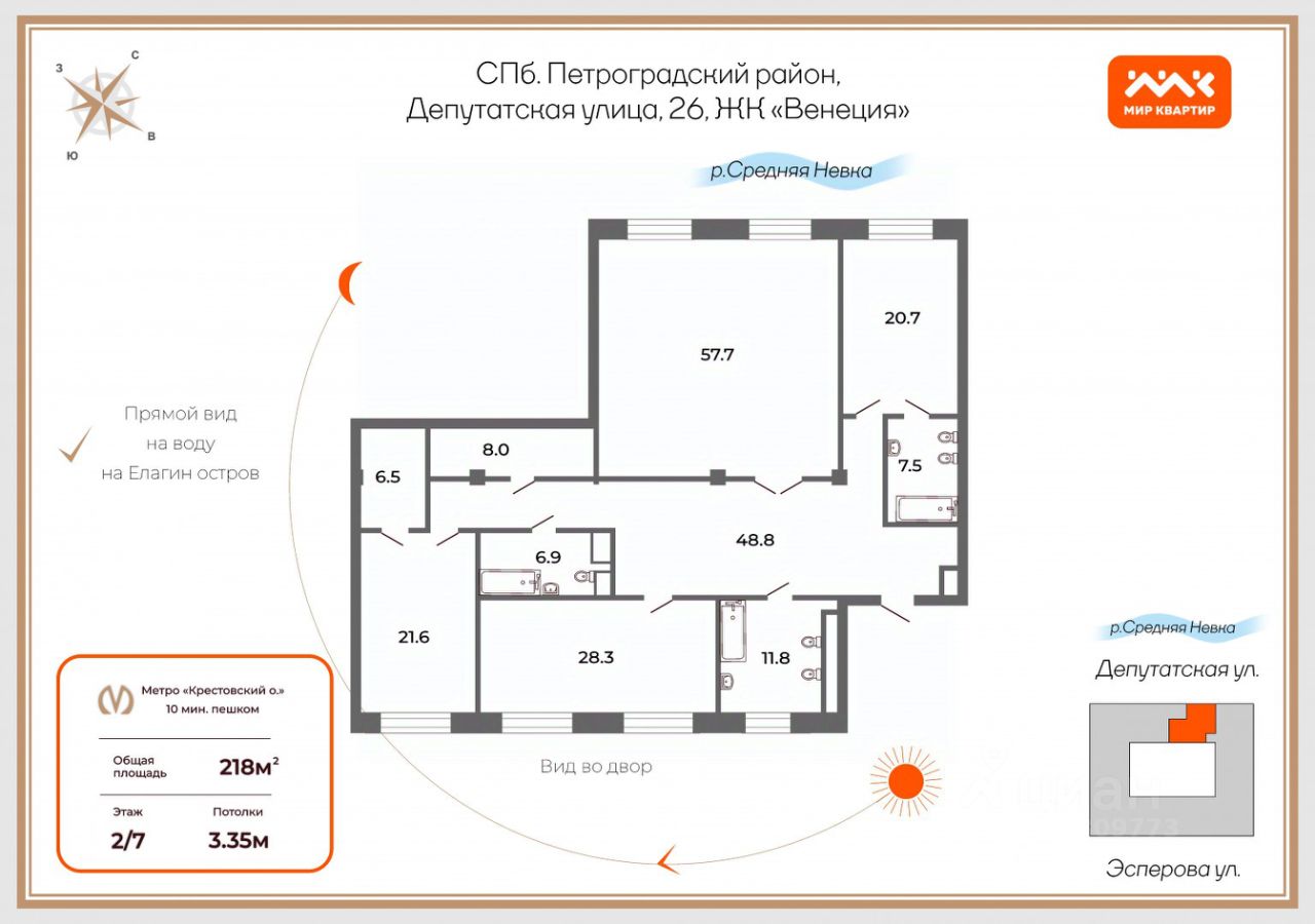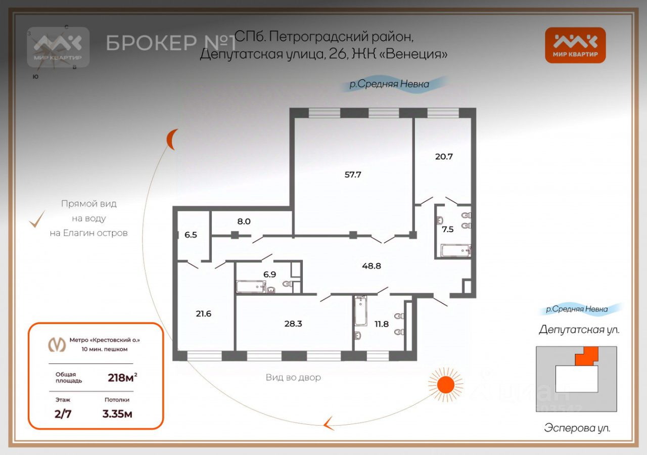Двусторонняя квартира площадью 218 кв.м расположена на втором этаже и обращена своими окнами на набережную Средней Невки, с которой открывается панорамный вид на Елагин остров. Окна спальни и ванной комнаты выходят во благоустроенный двор-атриум , который накрыт стеклянным куполом. Две мастер- спальни со своими сан. узлами и гардеробными, гостиная 60кв.м с видом на воду.