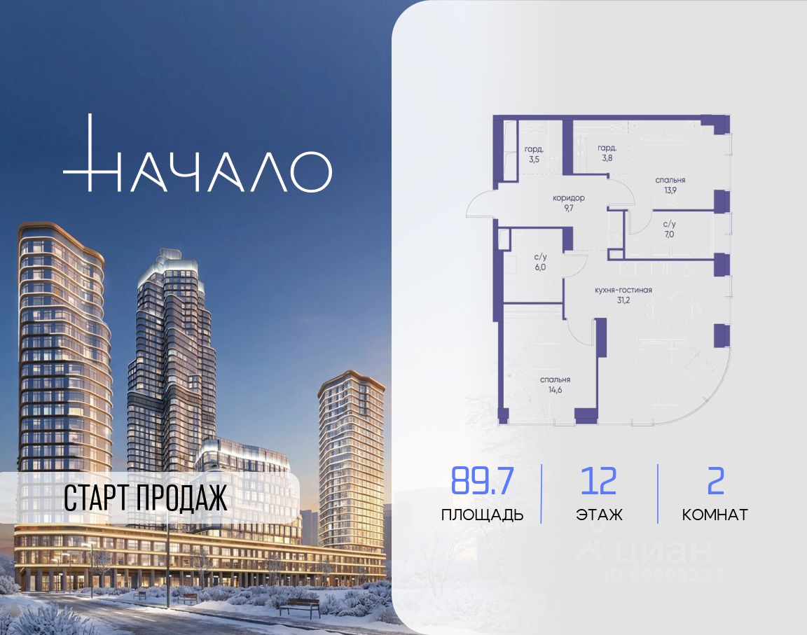 В престижном районе Пресня, на перекрестке делового и исторического центров Москвы, продается двухкомнатная квартира площадью 89.70 кв. м без отделки. Квартира находится на 12 этаже 48-этажного дома, в новом элитном жилом комплексе ''Начало'' от девелопера ''Донстрой''. Реализация проекта запланирована на 1 квартал 2030 года.