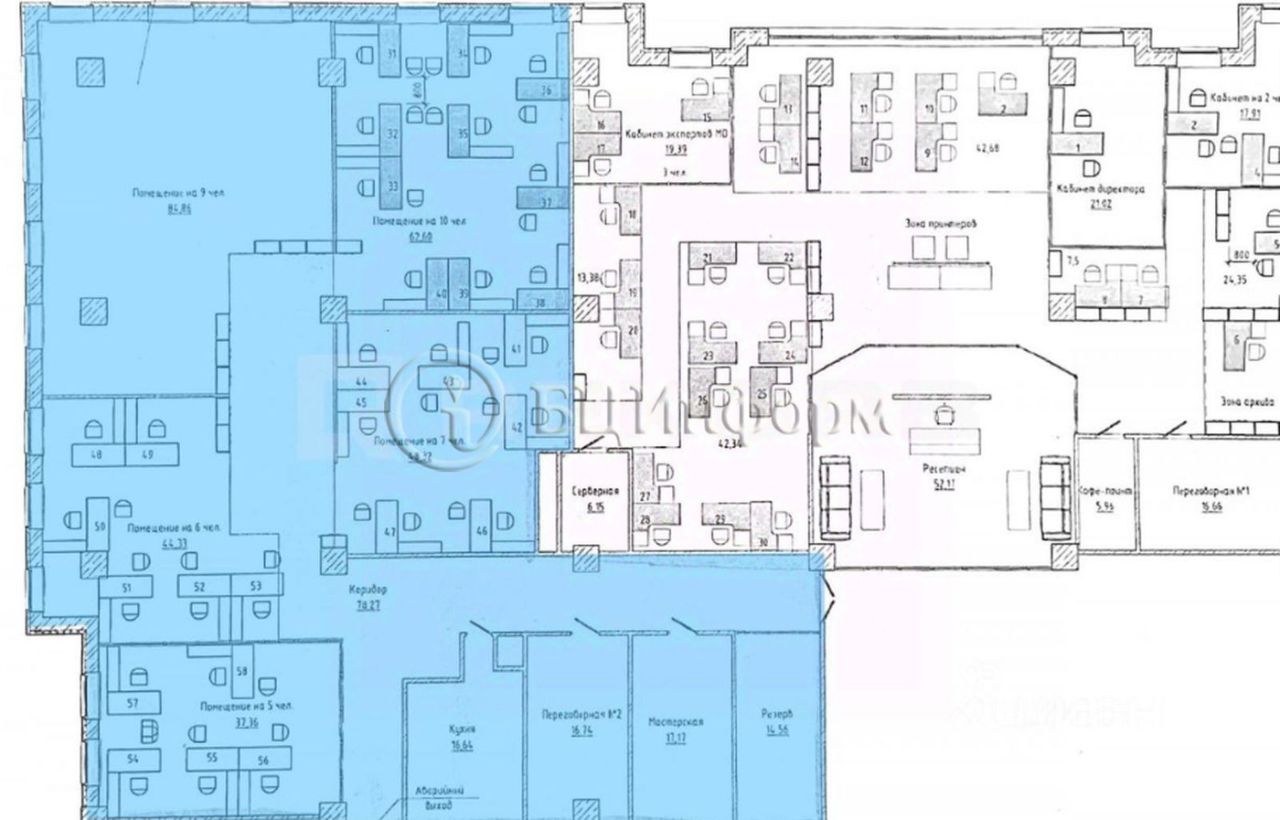 Смешанная планировка: кабинеты различного метража, помещение под кухню, переговорная.