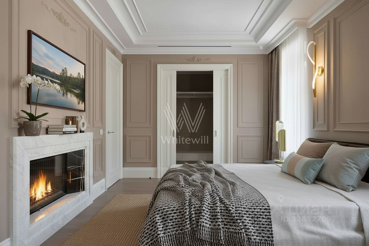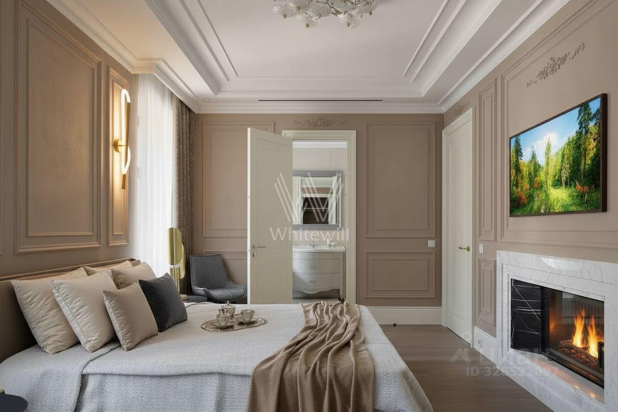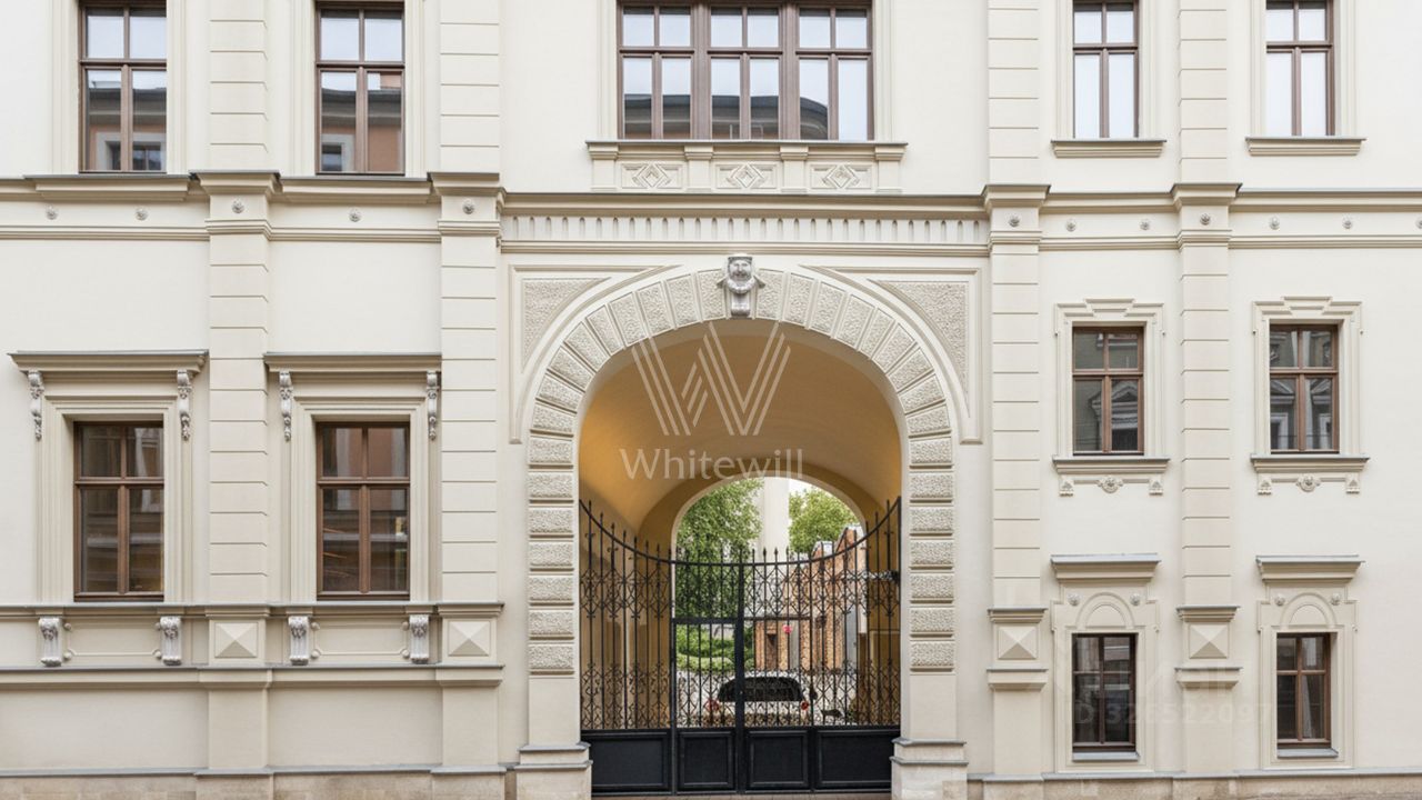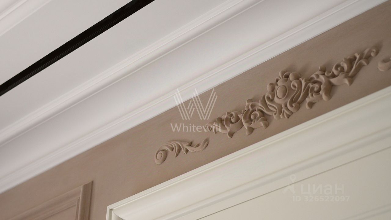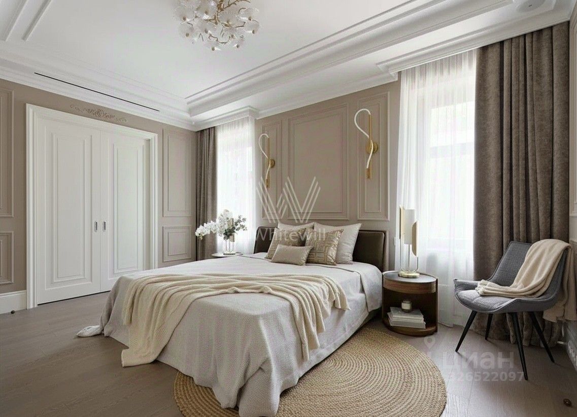 Квартира с премиальной дизайнерской отделкой и мебелью расположена на втором этаже. Светлый интерьер оформлен в стиле современной классики. Высокие потолки, большие окна со стороны кухни-гостиной.