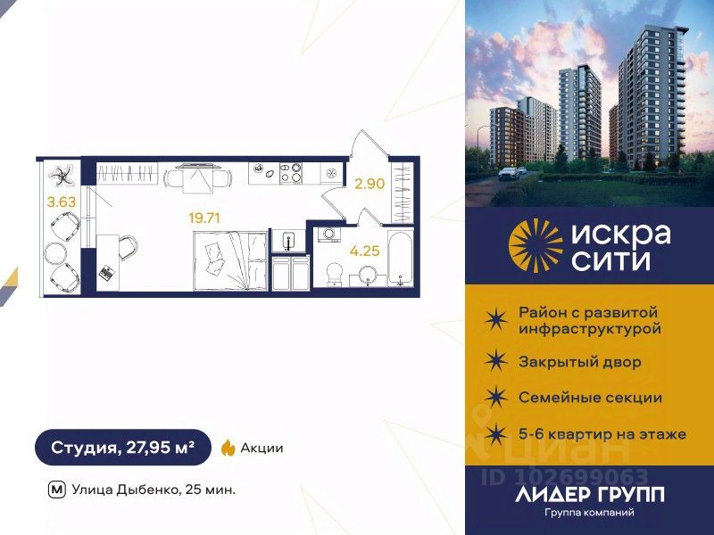 ''ИСКРА-Сити'' — жилой комплекс комфорт-класса на 777 квартир, ориентированный на семейных покупателей. В проекте очень мало студий. Дом возводится на правом берегу Невы, в Невском районе Санкт-Петербурга, между улицей Тельмана и переулком Челиева - в створе Искровского проспекта. Это давно сложившийся район без высотной или уплотнительной застройки. Прогулка до ближайшей станции метро ''ул. Дыбенко'' займёт всего 25 минут. Отлично развито транспортное сообщение. Рядом гипермаркет ''Максидом''. 4 корпуса переменной этажности от 13 до 18, объединены подземным паркингом. На первых этажах будут располагаться магазины, пекарни, аптеки и салоны красоты, есть собственный детский сад.Квартиры с угловым остеклением, собственными кладовыми. Большие ванные с окном и просторные балконы.