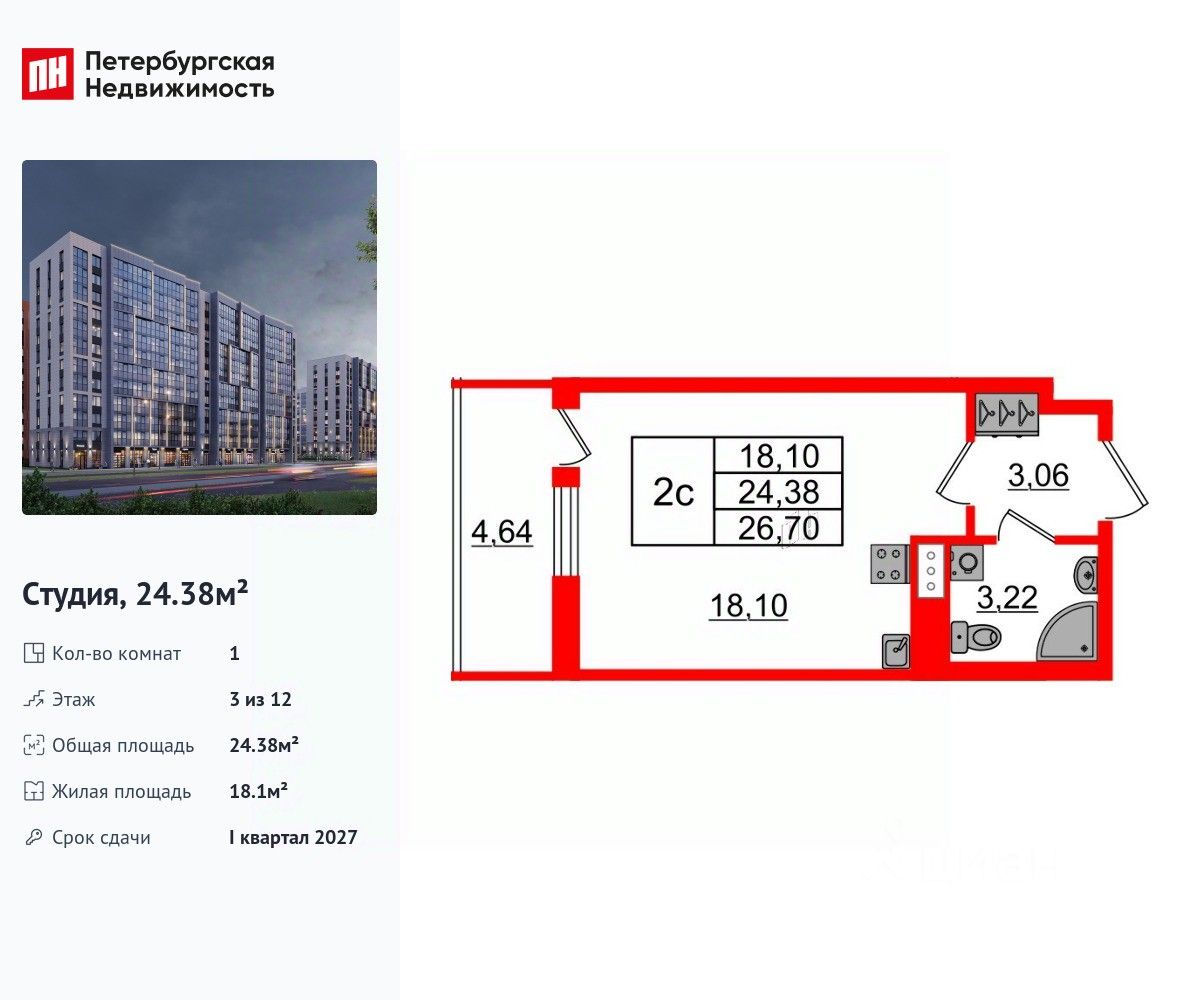 Удобная, классическая, функциональная европланировка, вместительная прихожая 3.06 м². Общая площадь студии - 24.38 м², жилая 18.1 м², высота потолка 2.77 м.