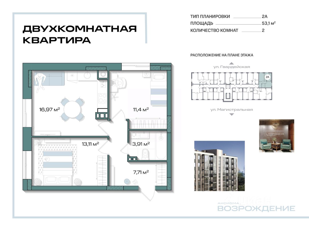 Продаётся 2-комнатная квартира в строящемся доме (Дом 6), срок сдачи: I-кв. 2028, общей площадью 53.1 кв.м., на 2 этаже. Новый клубный дом ''Аксиома.Возрождение'' от застройщика ''Аксиома'' расположен по адресу: г. Кировск, ул. Красных Сосен, 6